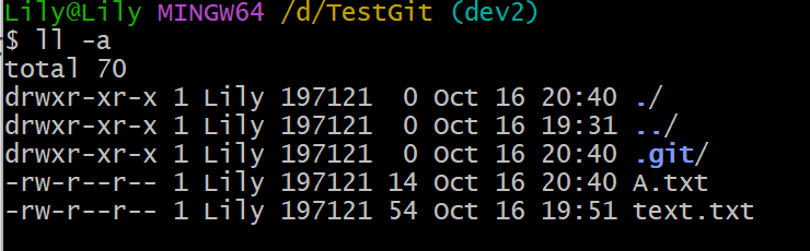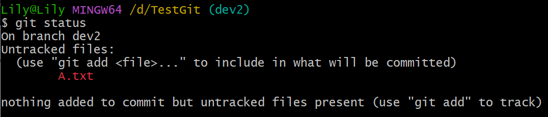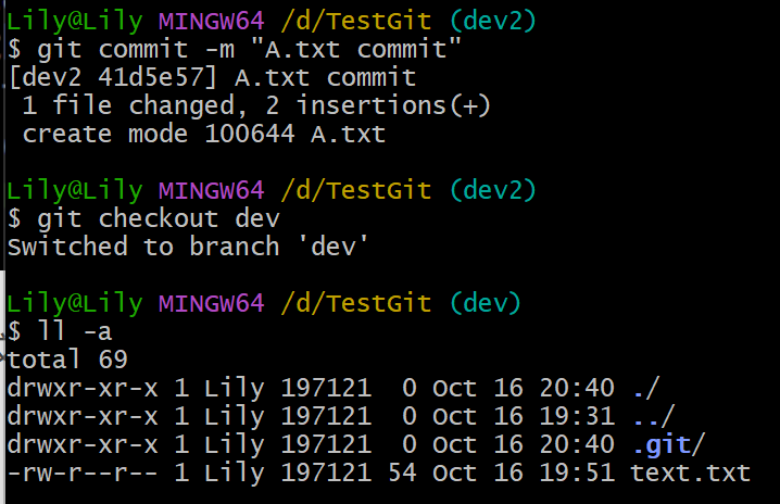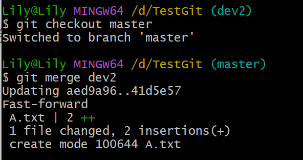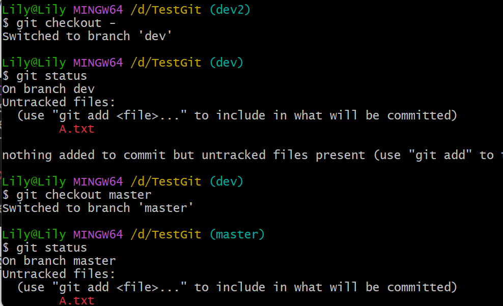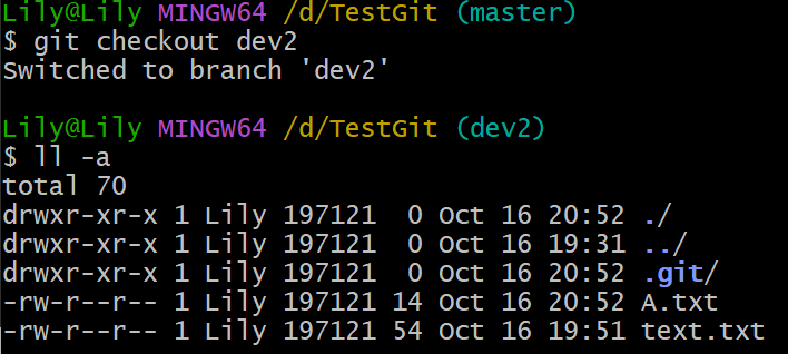 此时dev分支和master下没有A.txt文件,dev2分支才有