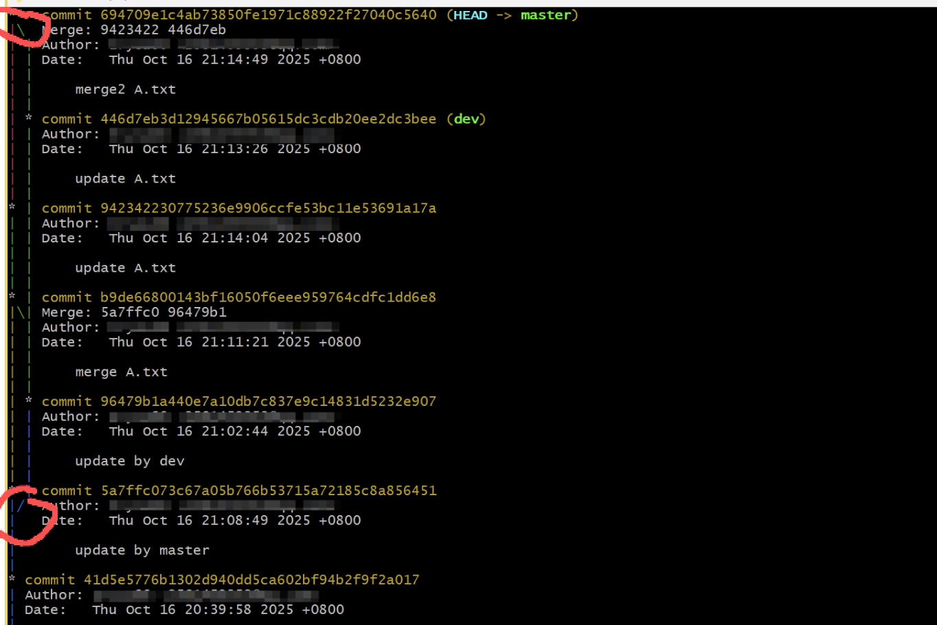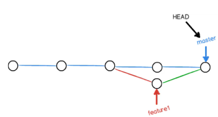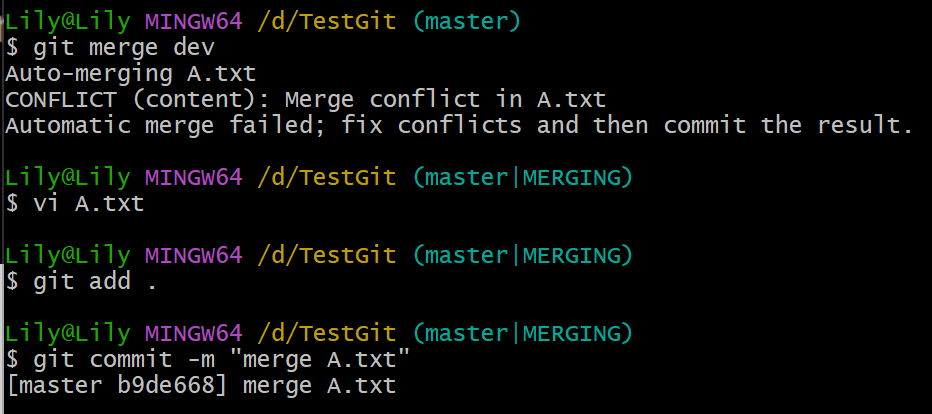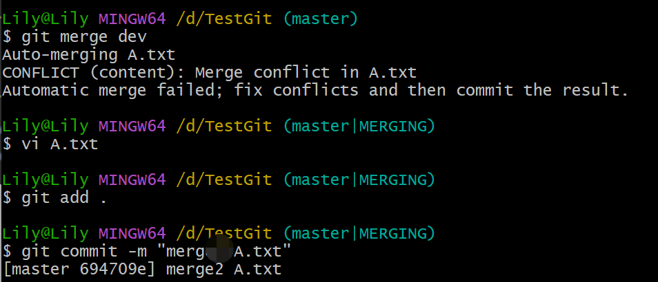 如图所示,下面的圈是产生冲突,上面的圈是手动合并完解决冲突。