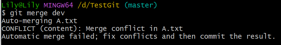 我们在dev分支里面修改A.txt文件添加一行 update by dev后提交