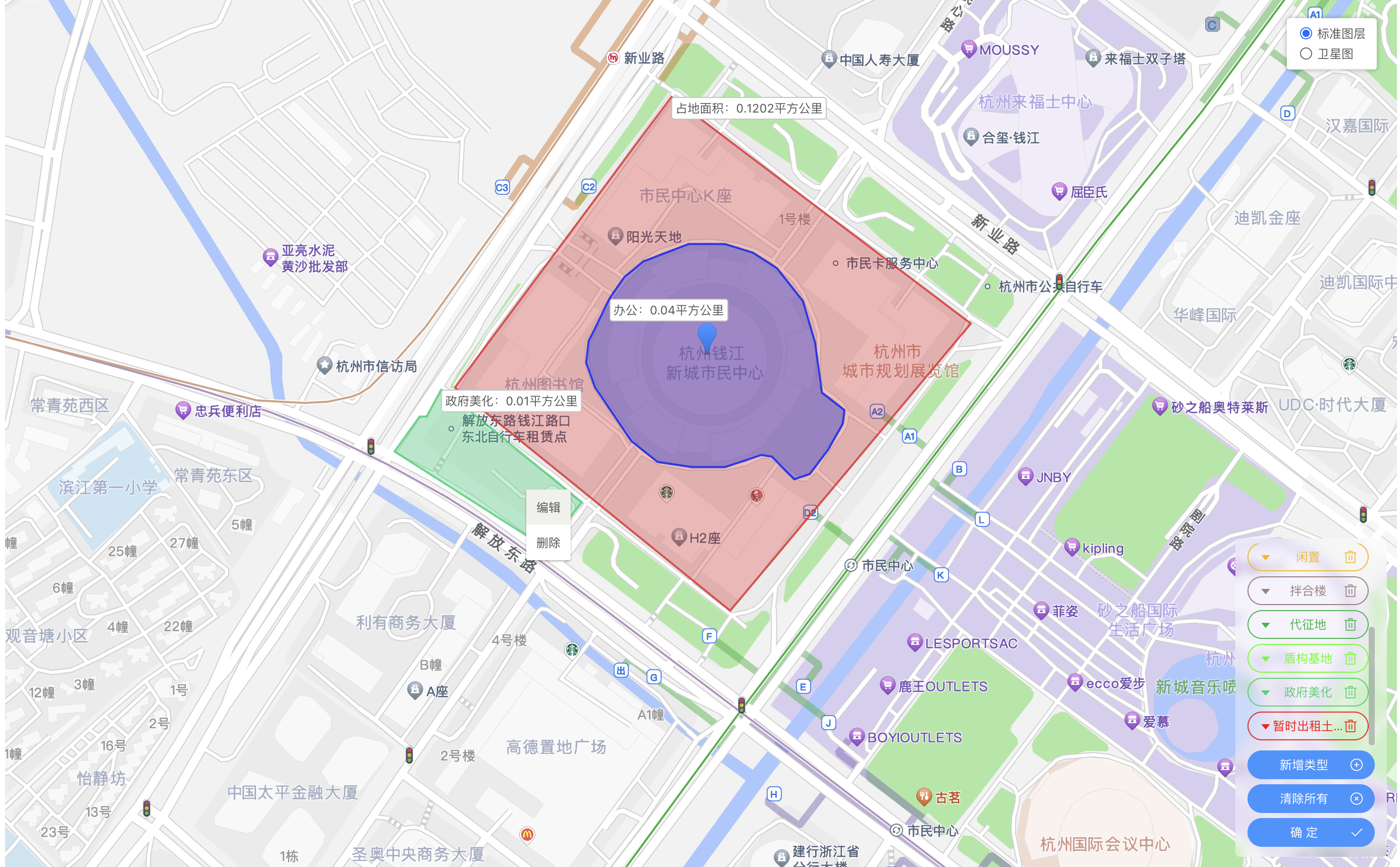 export default {data() {return {// 中心坐标 默认为杭州市政府的坐标initDrop: [120.209758, 30.246809],// 地图实例map: null,zoom: 12,mouseTool: null,areaTypeList: [],areaTypeActive: '',areaList: [],contextMenu: null,contextMenuPosition: null,polygonEditor: null,areaTypeAddShow: false,areaTypeAddFrom: {colorType: '#409eff',areaName: '',},areaData: [],};},created() {this.areaTypeList = [{id: 1,areaType: '1',areaName: '占地面积',colorType: '#ec3636',orderNo: 1,delFlag: 'N',remark: null,},{id: 2,areaType: '2',areaName: '使用面积',colorType: '#3f2ec2',orderNo: 2,delFlag: 'N',remark: null,},{id: 3,areaType: '7',areaName: '出租',colorType: '#00f529',orderNo: 7,delFlag: 'N',remark: null,},{id: 4,areaType: '5',areaName: '办公',colorType: '#0824f7',orderNo: 5,delFlag: 'N',remark: null,},{id: 5,areaType: '4',areaName: '闲置',colorType: '#f9c301',orderNo: 4,delFlag: 'N',remark: null,},{id: 6,areaType: '6',areaName: '拌合楼',colorType: '#a78b8b',orderNo: 6,delFlag: 'N',remark: null,},{id: 7,areaType: '8',areaName: '代征地',colorType: '#20bc56',orderNo: 8,delFlag: 'N',remark: null,},{id: 8,areaType: '3',areaName: '盾构基地',colorType: '#44ff00',orderNo: 3,delFlag: 'N',remark: null,},{id: 9,areaType: '9',areaName: '政府美化',colorType: '#29d67d',orderNo: 9,delFlag: 'N',remark: null,},{id: 10,areaType: '10',areaName: '暂时出租土地',colorType: '#ff0000',orderNo: 10,delFlag: 'N',remark: null,},];},mounted() {this.initMap();},methods: {initMap(centerToe) {var centerToe = centerToe || this.initDrop;this.loadMap(centerToe).then(() => {this.areaData = [{type: 'marker',position: [120.529364, 30.356372],},{type: 'polygon',path: [['120.529011', '30.356501'],['120.528988', '30.35636'],['120.529846', '30.356193'],['120.529892', '30.356329'],['120.529871', '30.356325'],],searchValue: null,createBy: null,createTime: null,updateBy: null,updateTime: null,delFlag: 'N',remark: null,orderBy: null,params: {},id: 38,mainId: 960,coordinateGroup: '120.529011,30.356501;120.528988,30.35636;120.529846,30.356193;120.529892,30.356329;120.529871,30.356325',actualArea: 1312.1,colorType: '#ec3636',areaType: '1',areaName: '占地面积',},];// 初始化传入数据时回显let isInit = true;if (isInit) this.initData();});},// 开始绘制measureArea(row) {let { areaType, colorType } = row;this.areaTypeActive = areaType;this.mouseTool.polygon({strokeColor: colorType,fillColor: colorType,fillOpacity: 0.3,});},// 关闭绘制面积closeMeasureArea() {if (this.polygonEditor) this.polygonEditor.close();this.areaTypeActive = '';this.map.clearMap();this.mouseTool.close(true);this.areaList = [];},// 绘制面积结束measureAreaOver(e) {// 增加覆盖物右键点击事件e.obj.on('rightclick', this.polygonRightClick);e.obj.on('click', this.mapClick);// 增加覆盖物提示文本let { areaName } = this.areaTypeList.find(item => item.areaType == this.areaTypeActive) || {};let textTitle = areaName;let updateData = {};if (!textTitle) {updateData = e.obj.getExtData();textTitle = updateData.areaName;}let timer = Number(new Date());e.obj.setExtData(timer);let textPosition = e.obj.getPath()[0];let textContent = `${textTitle}:${(e.obj.getArea() / 1000000).toFixed(4)}平方公里`;var text = new AMap.Text({text: textContent,position: textPosition,style: {'font-size': '12px',},extData: timer,});text.setMap(this.map);// 将覆盖物信息整合加入到全局let area = this.areaTypeList.find(item => item.areaType == this.areaTypeActive) || {};area = {...updateData,...area,area: e.obj.getArea(),path: e.obj.getPath(),data: e.obj,type: 'polygon',};this.areaList.push(area);this.areaTypeActive = '';if (this.mouseTool) this.mouseTool.close();},// 获取右键点击的面积信息getClickArea() {let delAreaList = this.areaList.filter(item => {let { lng, lat } = this.contextMenuPosition || {};return item.data.contains(new AMap.LngLat(lng, lat));});if (!delAreaList?.length) return {};let delArea = delAreaList[delAreaList.length - 1];let allOverlays = this.map.getAllOverlays('text');let textMark = allOverlays.find(item => item.getExtData() == delArea.data.getExtData());let areaIndex = this.areaList.findIndex(item => item.data.getExtData() == delArea.data.getExtData());return { areaData: delArea, text: textMark, areaIndex };},// 面积编辑事件measureAreaUpdate(e) {this.contextMenu.close();let { areaData } = this.getClickArea();this.polygonEditor = new AMap.PolygonEditor(this.map, areaData.data);this.polygonEditor.open();},// 编辑面积保存measureAreaSave() {this.polygonEditor.close();this.polygonEditor = null;let { areaData, text, areaIndex } = this.getClickArea();text.setText(`${areaData.areaName}:${(areaData.data.getArea() / 1000000).toFixed(2)}平方公里`);let updateArea = {...areaData,area: areaData.data.getArea(),path: areaData.data.getPath(),};text.setPosition(updateArea.path[0]);this.areaList[areaIndex] = updateArea;},// 删除覆盖物measureAreaDel() {this.contextMenu.close();let { areaData, text, areaIndex } = this.getClickArea() || {};if (text && text?.destroy) text.destroy(null);if (areaData?.data?.destroy) areaData.data.destroy(null);this.areaList = this.areaList.filter((item, index) => index !== areaIndex);},// 加载地图loadMap(centerToe) {var centerToe = centerToe || this.initDrop;return new Promise((resolve, reject) => {this.map = new AMap.Map('myMap', {zoom: this.zoom, //级别center: centerToe, //中心点坐标});AMap.plugin(['AMap.MapType', 'AMap.MouseTool', 'AMap.ContextMenu', 'AMap.PolygonEditor'], () => {// 右键点击this.map.addControl(new AMap.MapType());this.mouseTool = new AMap.MouseTool(this.map);this.mouseTool.on('draw', this.measureAreaOver);});this.map.on('click', this.mapClick);resolve();});},initData() {this.areaData.forEach(item => {let { type } = item;switch (type) {case 'marker':this.mapMarker = this.createdMarker(item?.position || [], item?.content || null, item);break;case 'polygon':this.createPolygon(item?.path || [], item);break;default:break;}});if (!this.ar