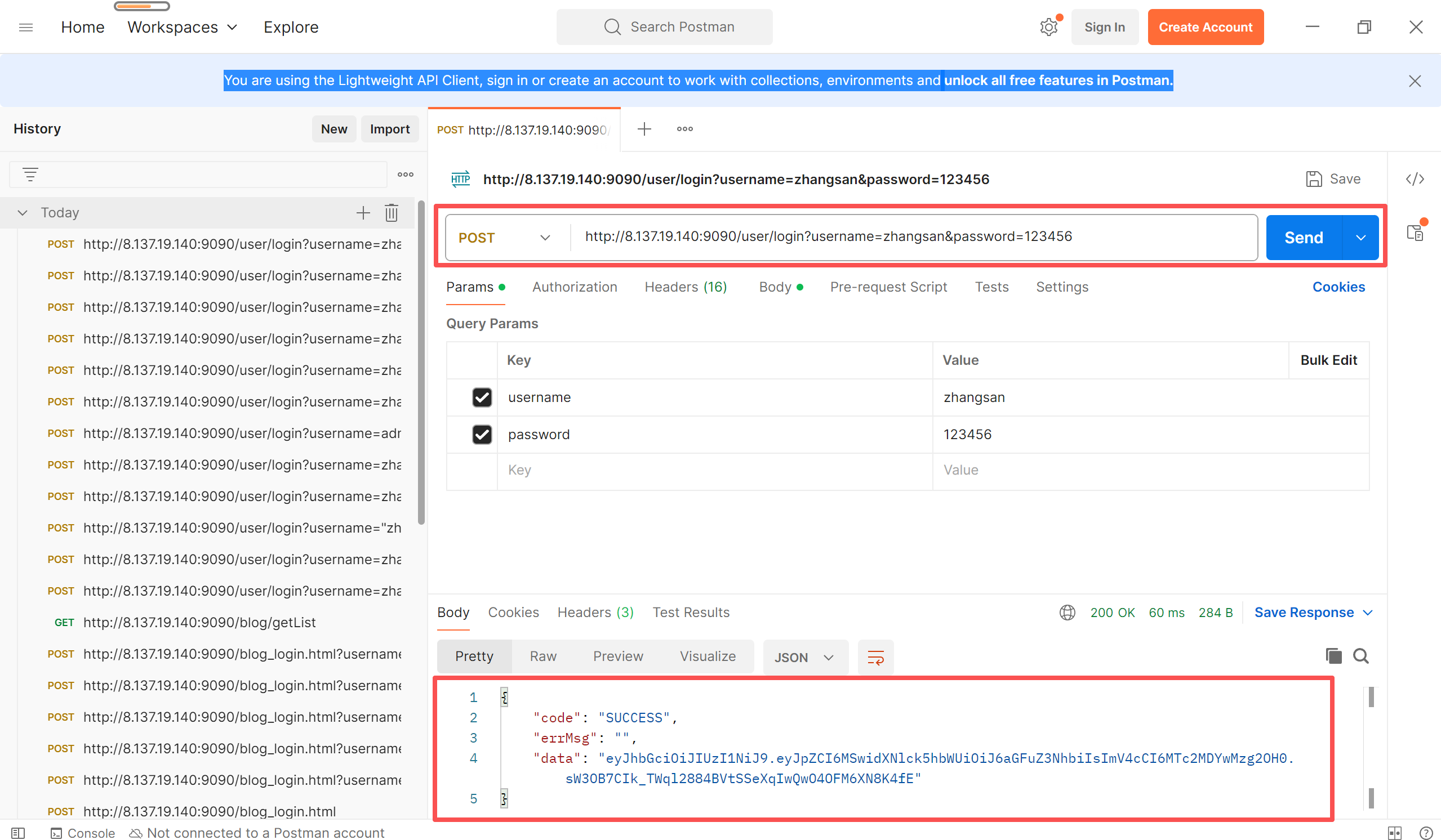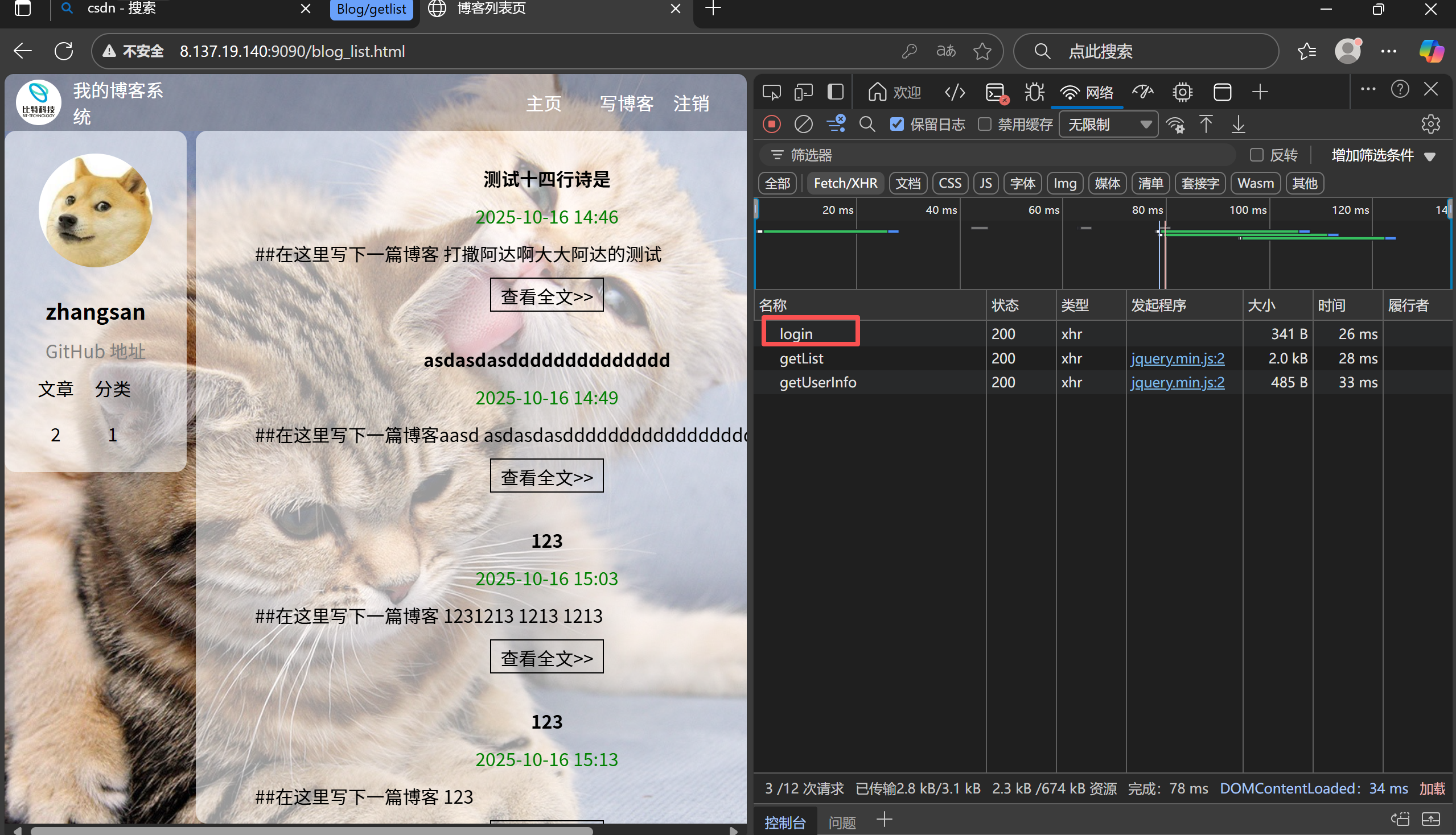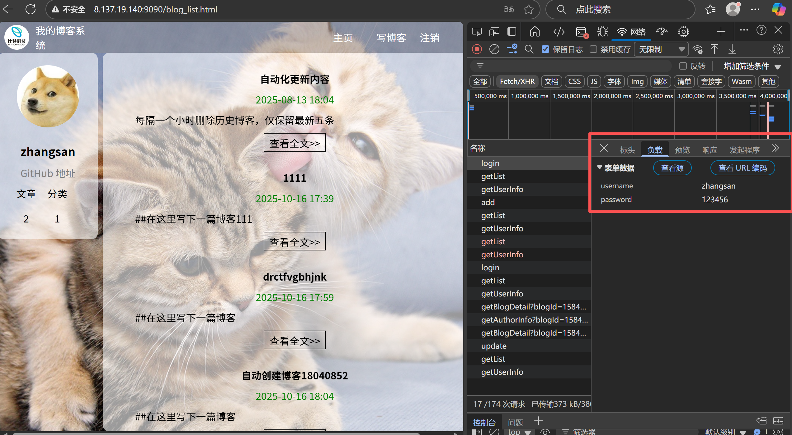 风险点:登录请求中密码以明文形式(123456)在网络中传输,若被攻击者通过抓包工具(如浏览器开发者工具、Wireshark等)拦截,可直接获取用户账号密码,进而非法登录系统、篡改用户博客数据,甚至可能通过该账号信息横向攻击用户其他关联平台(如用户复用密码的情况)。