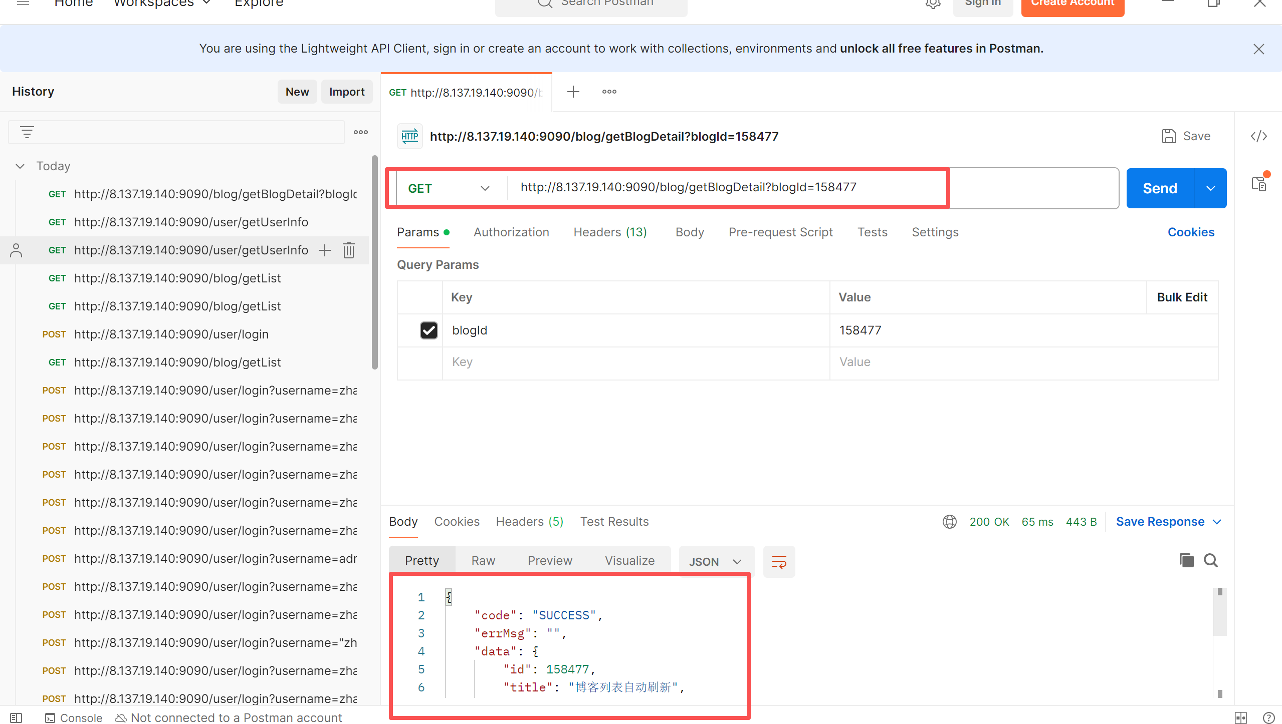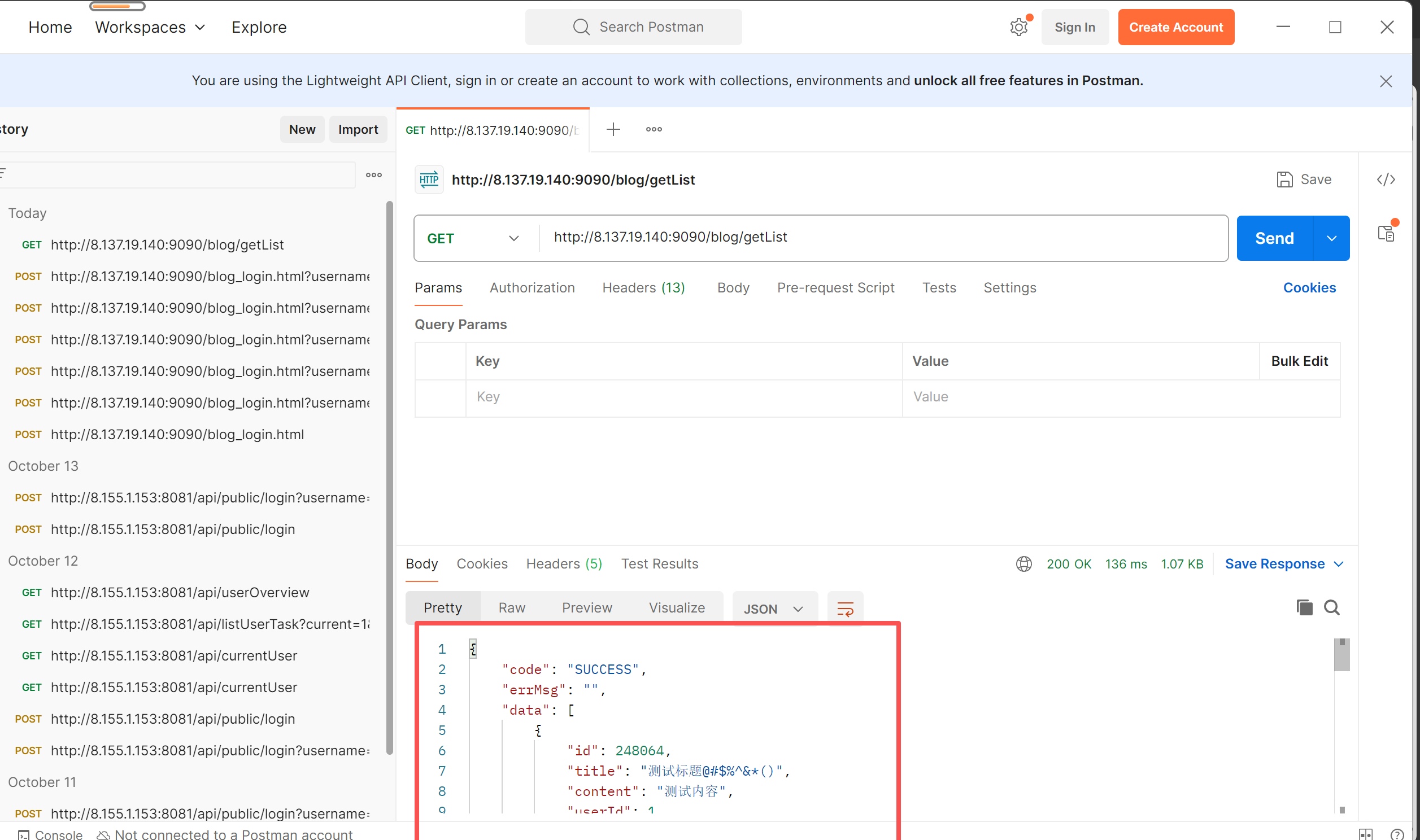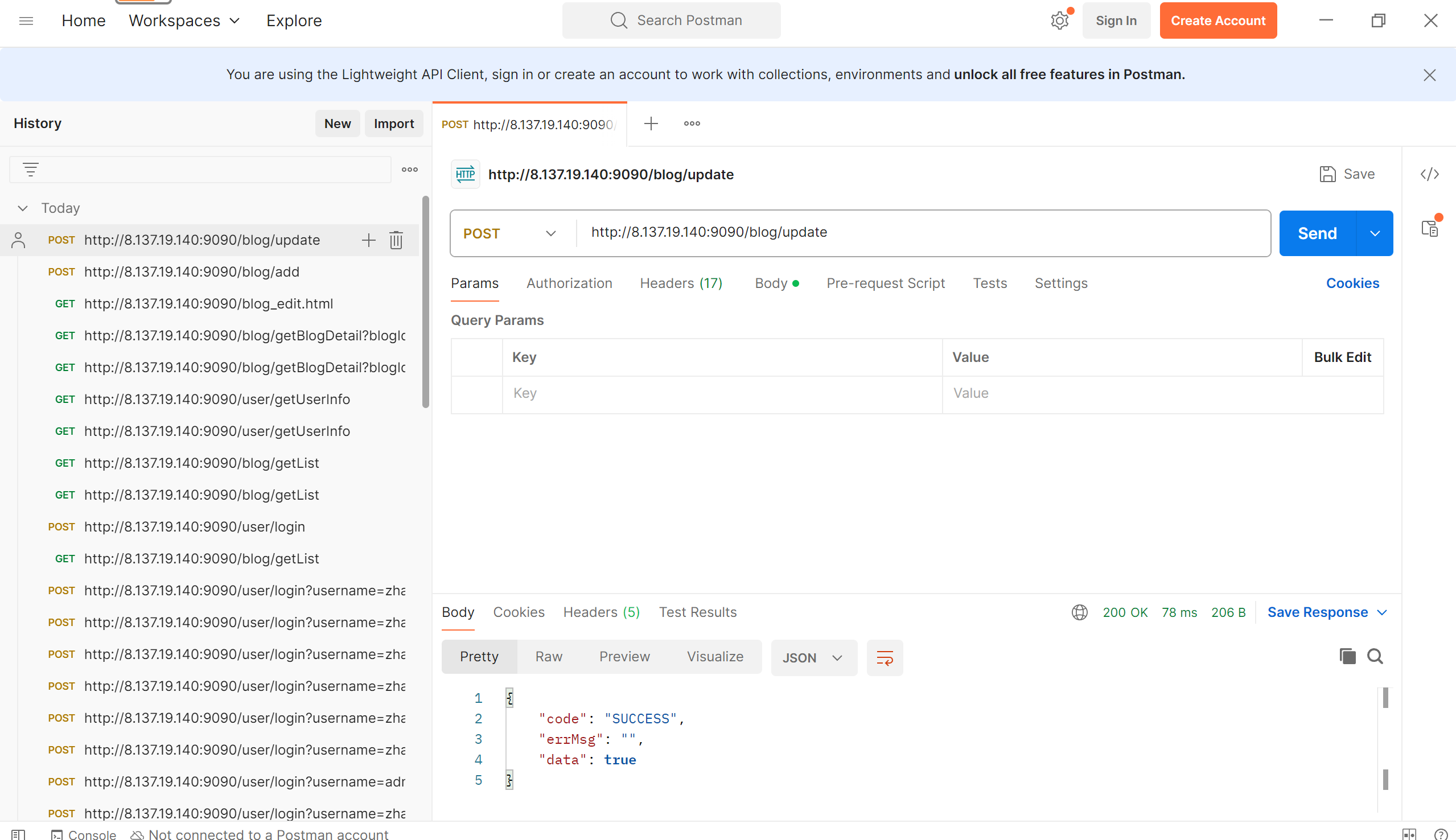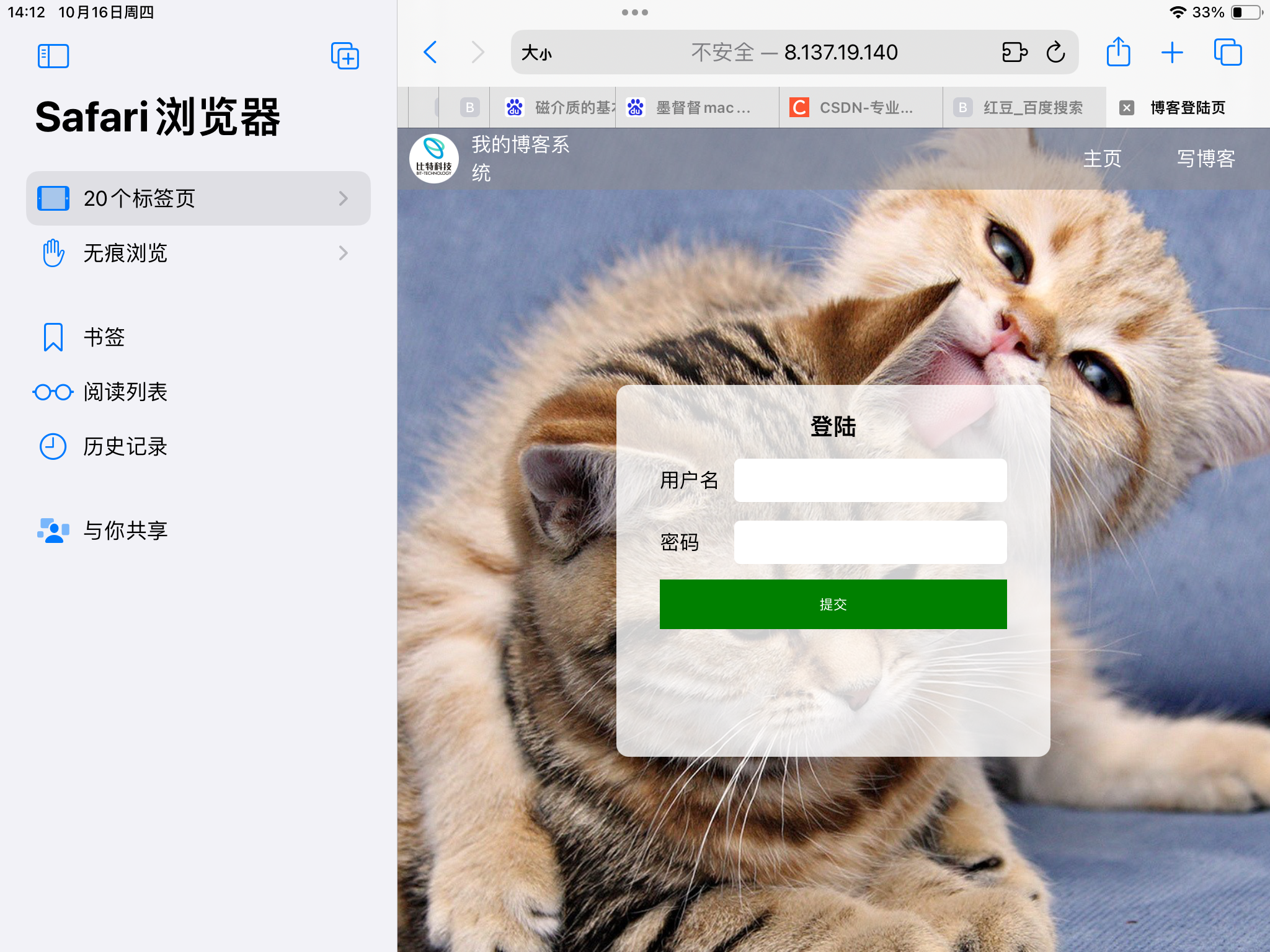 风险点:登录请求中密码以明文形式(123456)在网络中传输,若被攻击者通过抓包工具(如浏览器开发者工具、Wireshark等)拦截,可直接获取用户账号密码,进而非法登录系统、篡改用户博客数据,甚至可能通过该账号信息横向攻击用户其他关联平台(如用户复用密码的情况)。