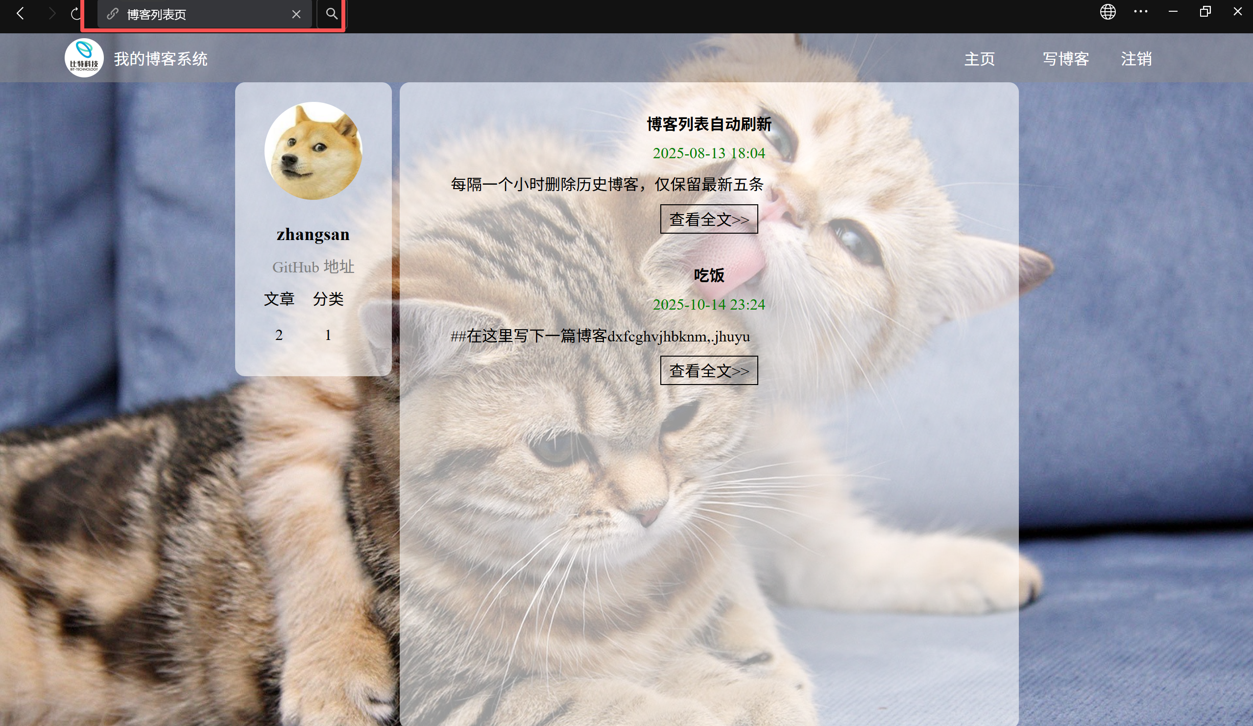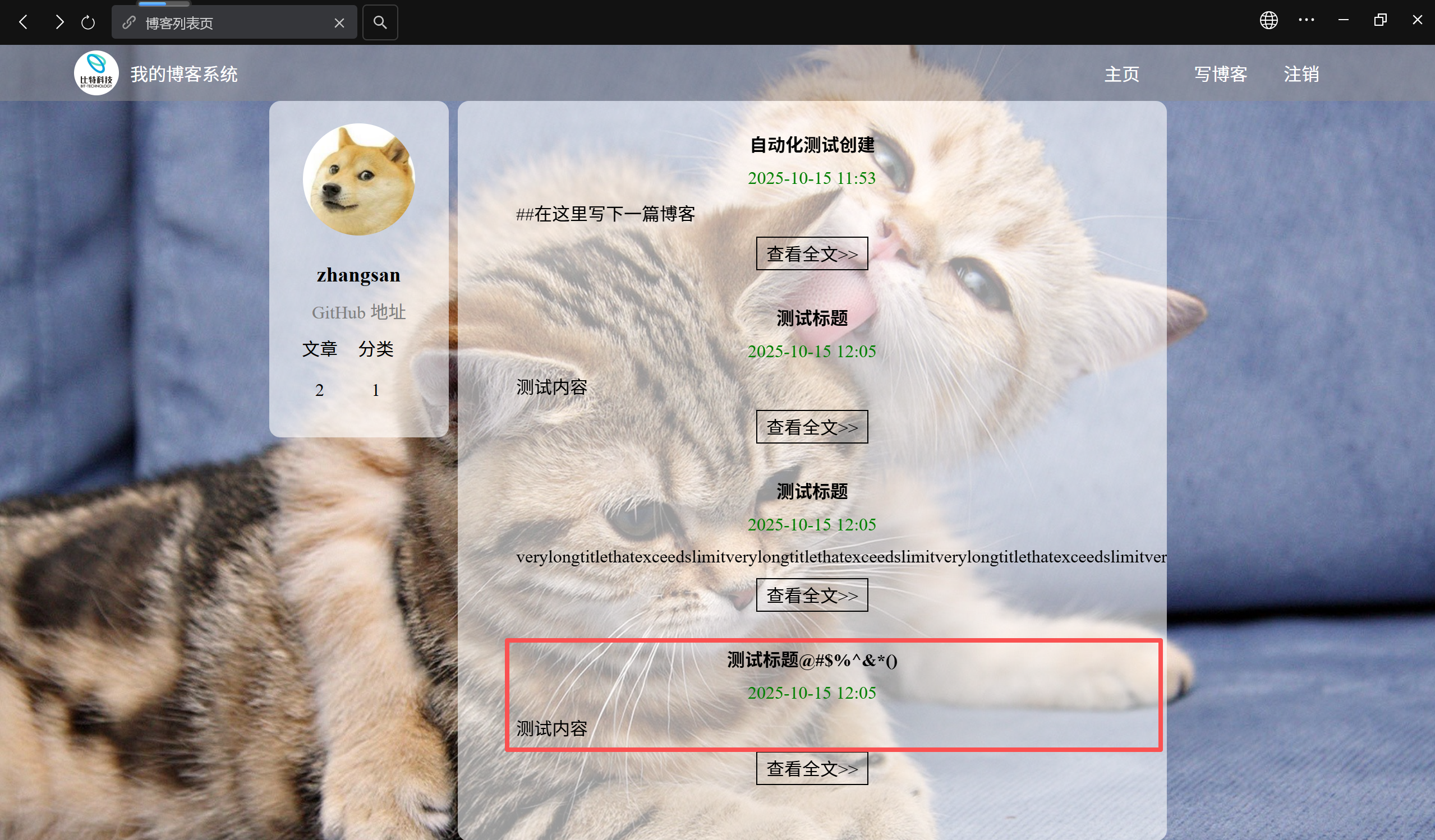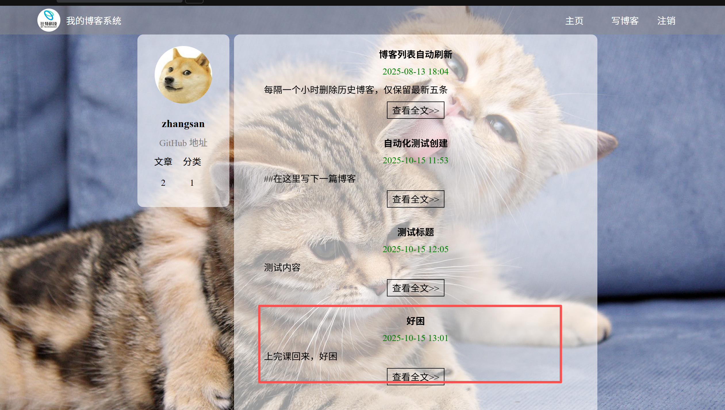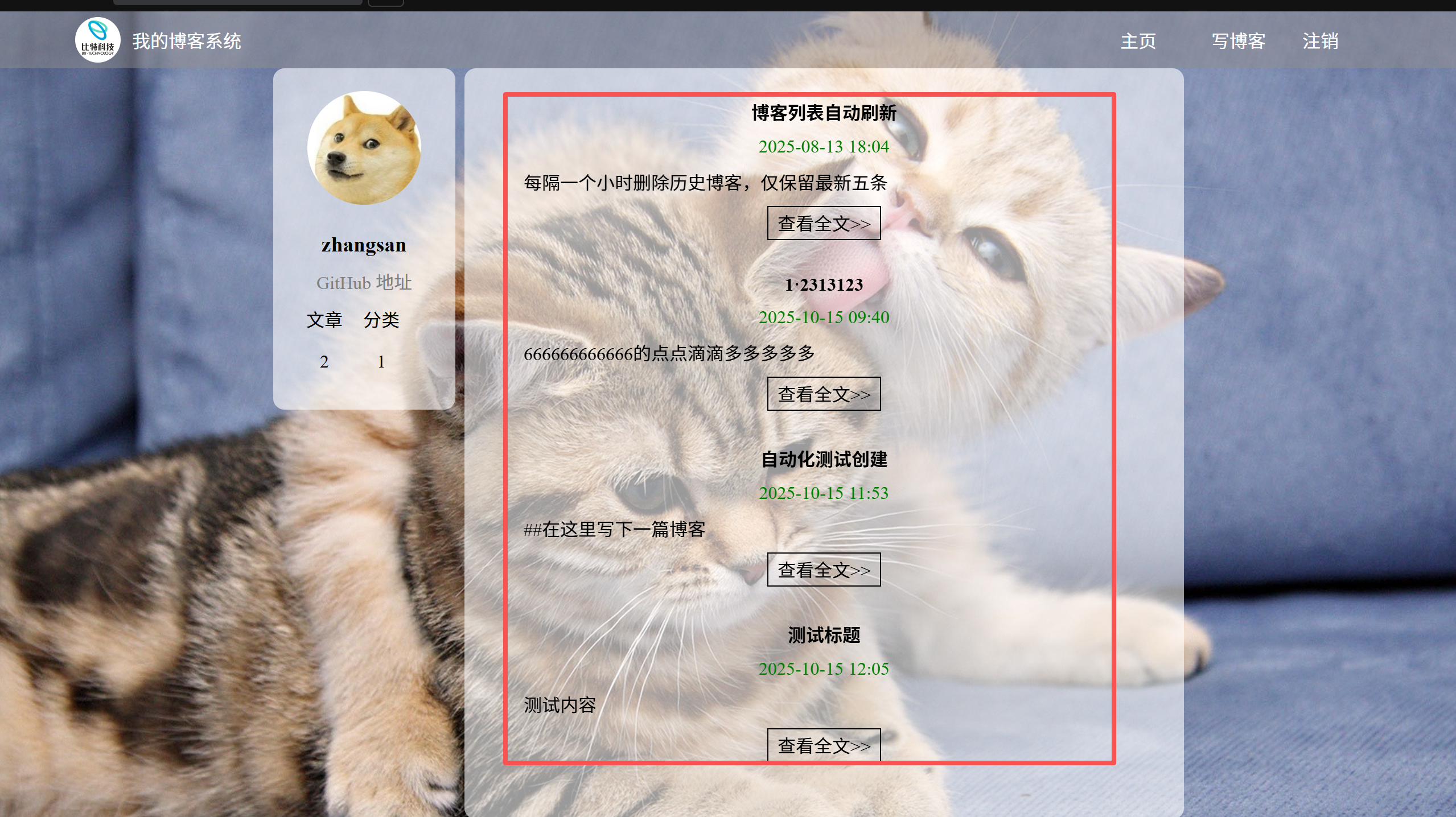 主页功能:能正确列出所有编辑且发布过的博客,实现内容展示的完整性;