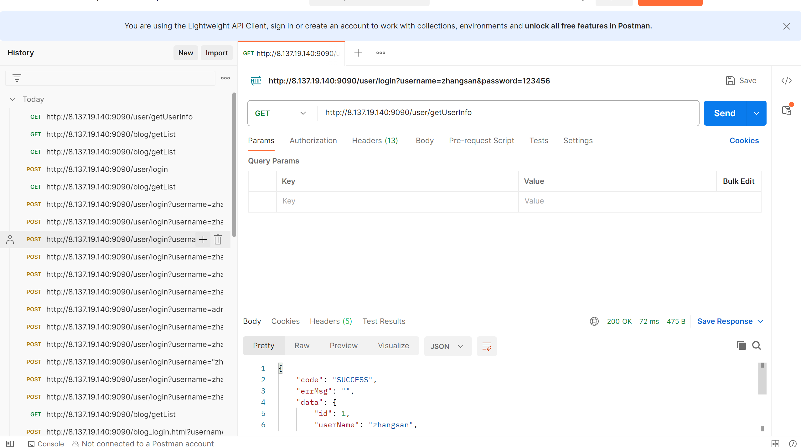 登录功能:账号(zhangsan)和密码(123456)能正常验证,保障用户身份识别的准确性;