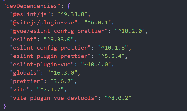 import prettierConfig from 'eslint-config-prettier'export default defineConfig([{name: 'app/files-to-lint',files: ['**/*.{js,mjs,jsx,vue}']},globalIgnores(['**/dist/**', '**/dist-ssr/**', '**/coverage/**']),{languageOptions: {globals: {...globals.browser}}},js.configs.recommended,...pluginVue.configs['flat/essential'],// 集成 Prettier 插件{plugins: {prettier: eslintPluginPrettier},rules: {'prettier/prettier': 'warn','vue/multi-word-component-names': ['warn',{ignores: ['index'] // vue组件名称多单词组成(忽略index.vue)}],'vue/no-setup-props-destructure': ['off'], // 关闭 props 解构的校验// 💡 添加未定义变量错误提示,create-vue@3.6.3 关闭,这里加上是为了支持下一个章节演示。'no-undef': 'error'}},// 集成 Prettier 配置,覆盖格式化相关规则prettierConfig