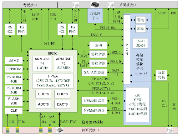 RS232、千兆网等接口,信号处理模块底板预留存储控制模块所需的固态硬盘接