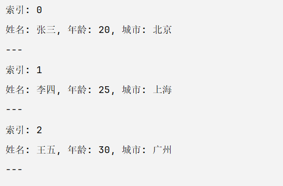 for index, row in df.iterrows():print(f"索引: {index}")print(f"姓名: {row['姓名']}, 年龄: {row['年龄']}, 城市: {row['城市']}")print("---")