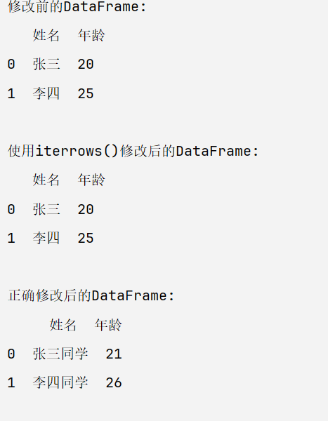 for index, row in df.iterrows():row['年龄'] = row['年龄'] + 1 # 尝试修改年龄row['姓名'] = row['姓名'] + '同学' # 尝试修改姓名print("\n使用iterrows()修改后的DataFrame:")