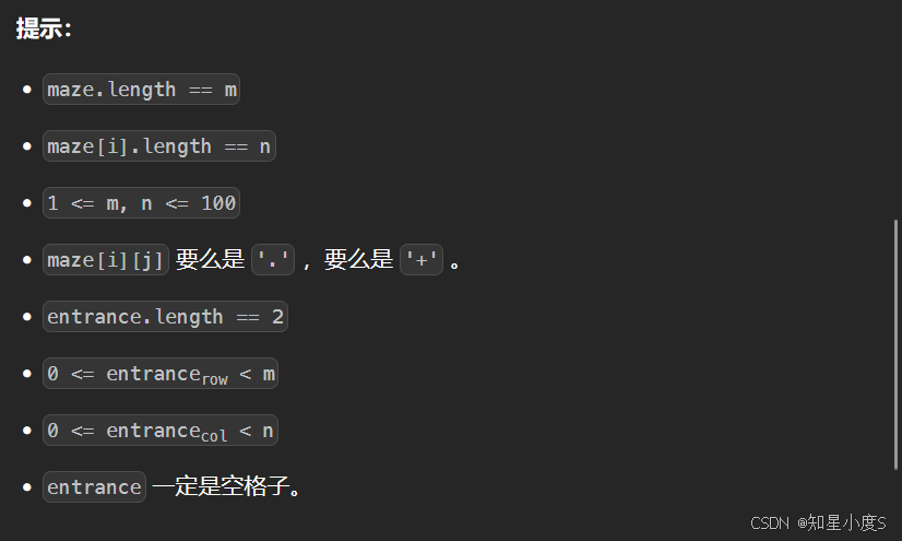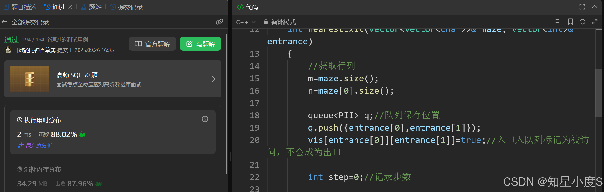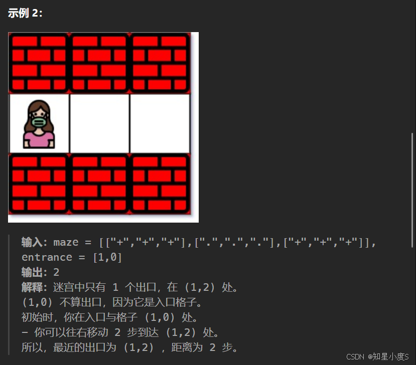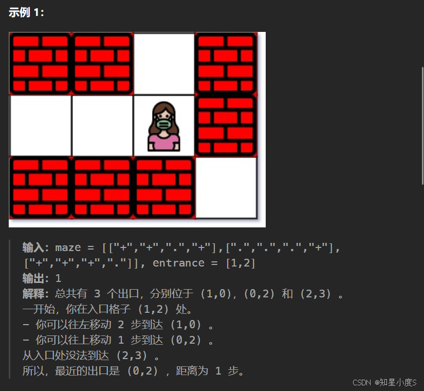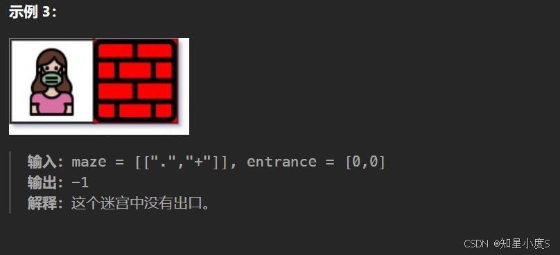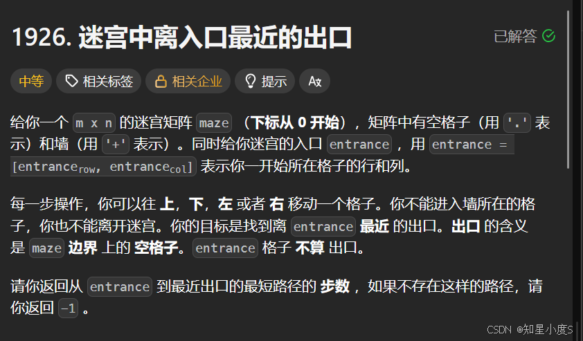 public:int nearestExit(vector<vector<char>>& maze, vector<int>& entrance){//获取行列m = maze.size();n = maze[0].size();queue<PII> q;//队列保存位置q.push({ entrance[0],entrance[1] });//入口入队列标记为被访问,不会成为出口vis[entrance[0]][entrance[1]] = true;int step = 0;//记录步数while (q.size()){step++;int sz = q.size();//处理当前层for (int i = 0; i < sz; i++){auto [qx, qy] = q.front();q.pop();for (int k = 0; k < 4; k++){int cx = qx + dx[k], cy = qy + dy[k];if (cx >= 0 && cx < m && cy >= 0 && cy < n && maze[cx][cy] == '.' && !vis[cx][cy]){//到达边界,返回步数if (cx == 0 || cx == m - 1 || cy == 0 || cy == n - 1){return step;}q.push({ cx,cy });vis[cx][cy] = true;}}}}//不存在路径,返回-1return -1;}