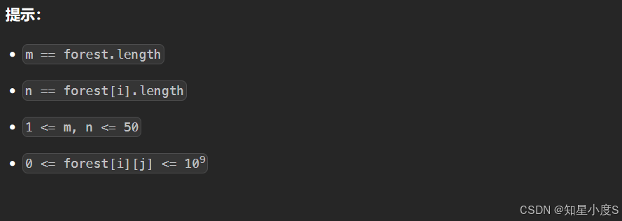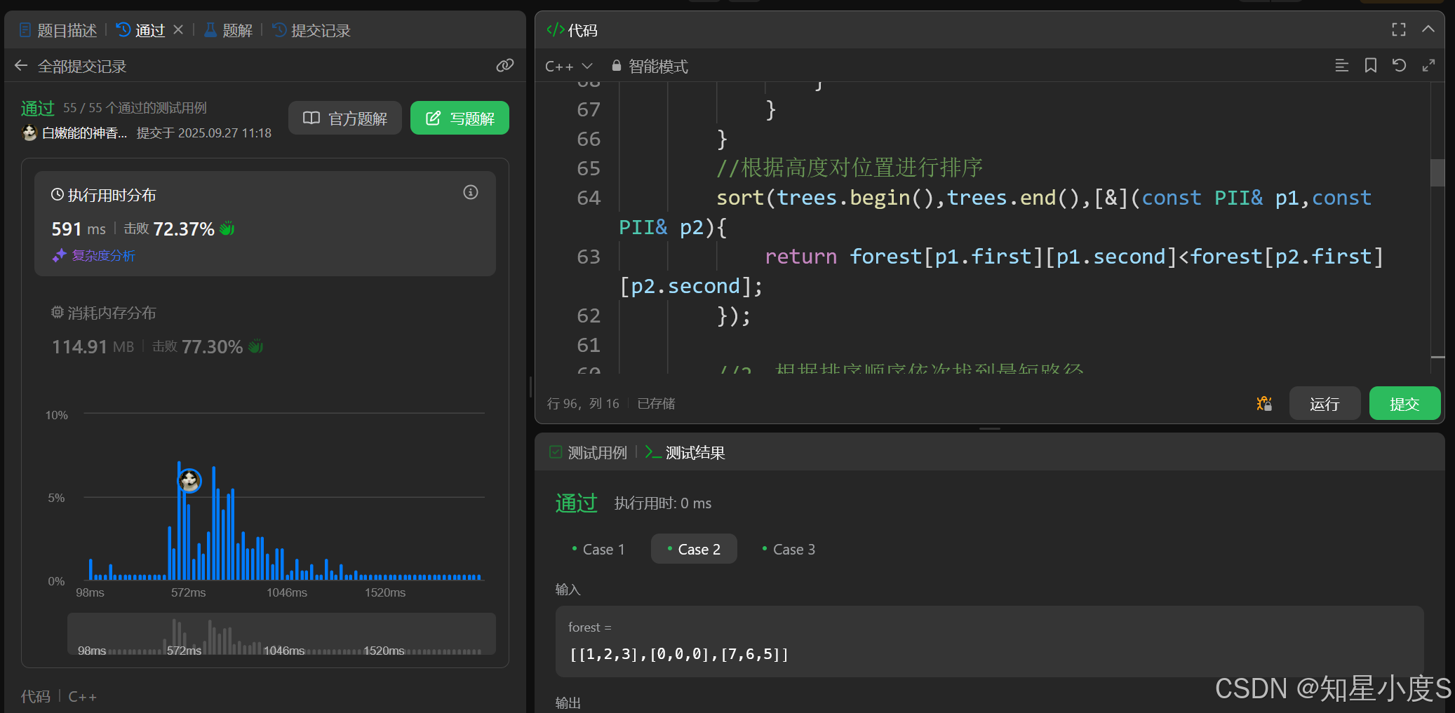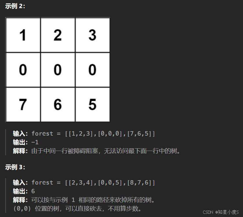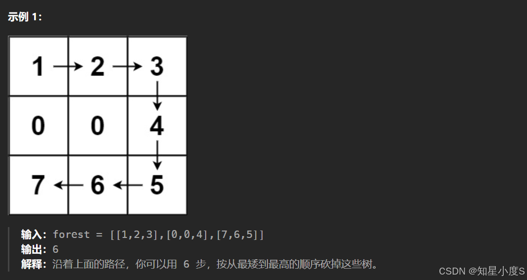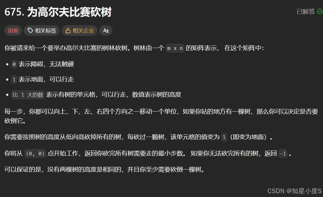 public:int cutOffTree(vector<vector<int>>& forest){//获取行列m = forest.size();n = forest[0].size();//1、按照树的高度进行排序vector<PII> trees;for (int i = 0; i < m; i++){for (int j = 0; j < n; j++){if (forest[i][j] > 1){trees.push_back({ i,j });}}}//根据高度对位置进行排序sort(trees.begin(), trees.end(), [&](const PII& p1, const PII& p2) {return forest[p1.first][p1.second] < forest[p2.first][p2.second];});//2、根据排序顺序依次找到最短路径int step = 0;//记录步数int bx = 0, by = 0;//起点【0,0】for (auto& [ex, ey] : trees){int ret = bfs(forest, bx, by, ex, ey);//无法到达,不存在路径if (ret == -1)return -1;//可以到达累积步数step += ret;//更新起点bx = ex, by = ey;}//3、返回结果return step;}//记录是否被访问bool vis[51][51] = { false };//BFS计算两个位置最短路径int bfs(vector<vector<int>>& forest, int bx, int by, int ex, int ey){//处理边界特殊情况——起点就是指定位置if (bx == ex && by == ey)return 0;memset(vis, 0, sizeof vis);//清除之前的记录queue<PII> q;q.push({ bx,by });vis[bx][by] = true;int ret = 0;//记录最小步数while (q.size()){ret++;int sz = q.size();while (sz--){auto [qx, qy] = q.front();q.pop();for (int i = 0; i < 4; i++){int cx = qx + dx[i], cy = qy + dy[i];if (cx >= 0 && cx < m && cy >= 0 && cy < n && !vis[cx][cy] && forest[cx][cy])//不越界,不是墙,未被访问——三者同时满足{//到达指定位置(下一个位置)返回步数if (cx == ex && cy == ey)return ret;//否则入队列,标记被访问,继续后续操作q.push({ cx,cy });vis[cx][cy] = true;}}}}//不能到达指定位置,返回-1return -1;}