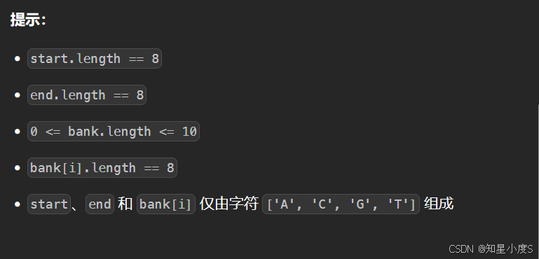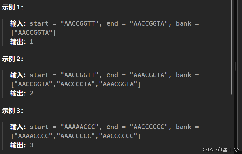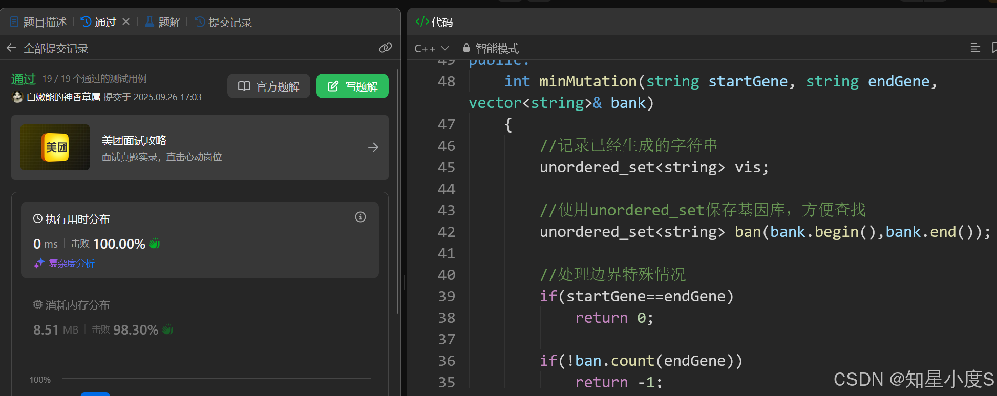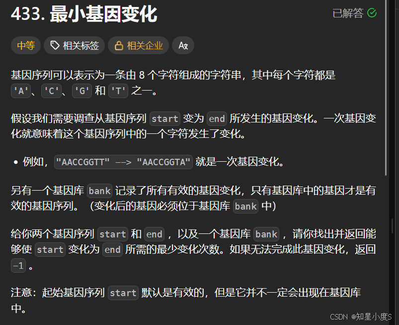 public:int minMutation(string startGene, string endGene, vector<string>& bank){//记录已经生成的字符串unordered_set<string> vis;//使用unordered_set保存基因库,方便查找unordered_set<string> ban(bank.begin(), bank.end());//处理边界特殊情况if (startGene == endGene)return 0;if (!ban.count(endGene))return -1;//变化字符string change = "AGCT";//记录变化次数int step = 0;queue<string> q;q.push(startGene);vis.insert(startGene);while (q.size()){int sz = q.size();step++;while (sz--){string qs = q.front();q.pop();//逐个修改当前字符串每一个字符for (int i = 0; i < 8; i++){string tmp = qs;for (int k = 0; k < 4; k++){tmp[i] = change[k];//没有被访问并且在基因库中if (!vis.count(tmp) && ban.count(tmp)){if (tmp == endGene)return step;q.push(tmp);vis.insert(tmp);}}}}}//没有结果,返回-1return -1;}