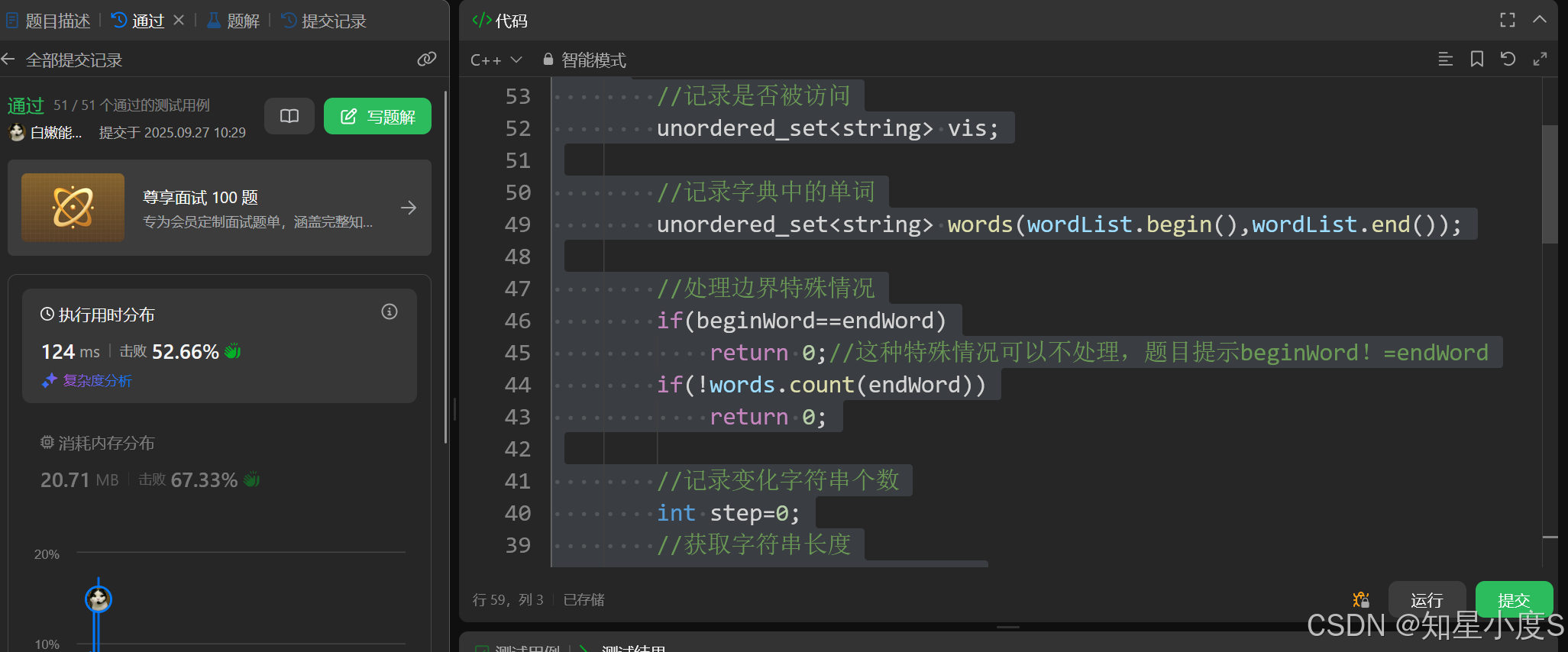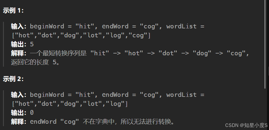 public:int ladderLength(string beginWord, string endWord, vector<string>& wordList){//记录是否被访问unordered_set<string> vis;//记录字典中的单词unordered_set<string> words(wordList.begin(), wordList.end());//处理边界特殊情况if (beginWord == endWord)return 0;//这种特殊情况可以不处理,题目提示beginWord!=endWordif (!words.count(endWord))return 0;//记录变化字符串个数int step = 0;//获取字符串长度int sn = beginWord.size();//队列进行BFS遍历保存queue<string> q;q.push(beginWord);vis.insert(beginWord);step++;//第一个字符串也进行计数while (q.size()){step++;//字符串个数++int sz = q.size();while (sz--){string qs = q.front();q.pop();//依次修改当前字符串的每一个字符for (int i = 0; i < sn; i++){string tmp = qs;for (char c = 'a'; c <= 'z'; c++){tmp[i] = c;if (!vis.count(tmp) && words.count(tmp)){if (tmp == endWord)return step;q.push(tmp);vis.insert(tmp);}}}}}//没有结果,返回0return 0;}
