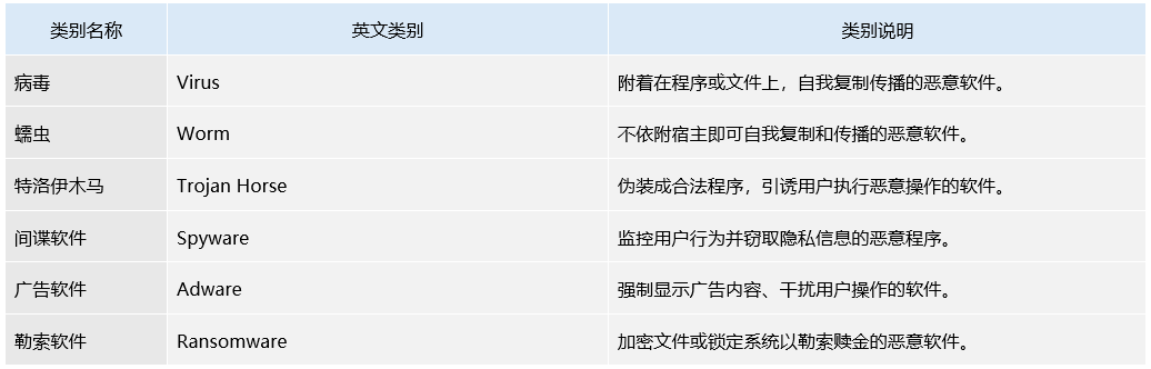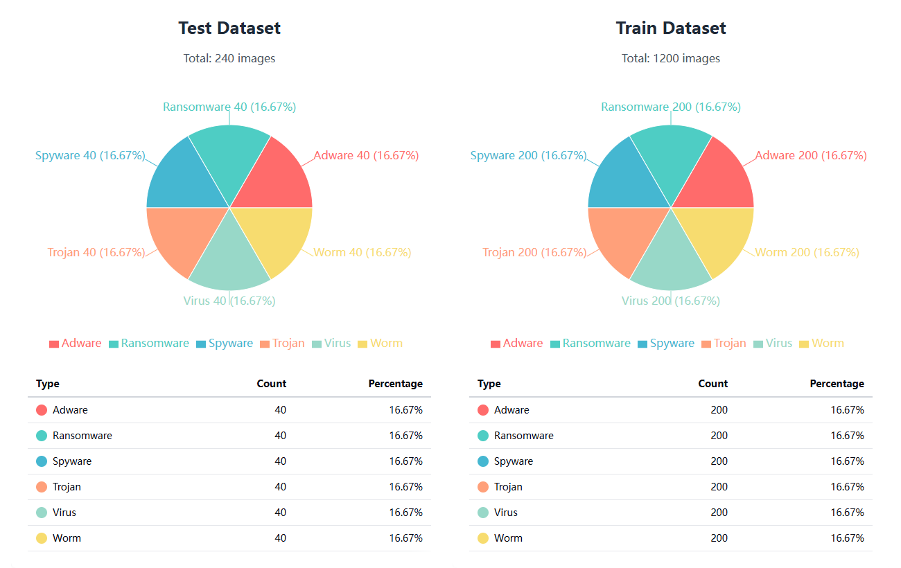 本数据集包含六类恶意软件样本:病毒(Virus)、蠕虫(Worm)、特洛伊木马(Trojan)、间谍软件(Spyware)、广告软件(Adware)和勒索软件(Ransomware)。该数据集旨在构建高精度的分类模型,实现对不同类型恶意软件行为的自动识别与检测,为网络安全分析和威胁防御提供辅助决策依据,推动深度学习与人工智能技术在恶意软件分析与网络安全防护中的应用。