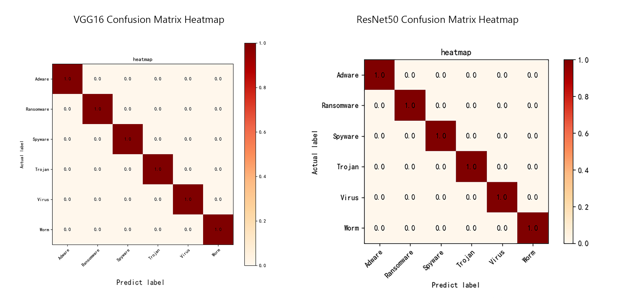 从混淆矩阵(Confusion Matrix Heatmap)结果来看,ResNet50 的性能略优于 VGG16。两种模型在六类恶意软件(Adware、Ransomware、Spyware、Trojan、Virus、Worm)分类中均表现出极高的准确率,混淆矩阵几乎呈现完美对角线结构,表明模型能够准确区分各类样本。然而,ResNet50 的分类结果更加稳定、泛化能力更强,其预测值全部精确集中在对角线上(值为1.0),无任何误分类,而 VGG16 虽然整体精度也高,但在训练初期存在轻微波动。综合来看,ResNet50 在恶意软件分类任务中整体表现更佳,准确率更高且鲁棒性更强。
