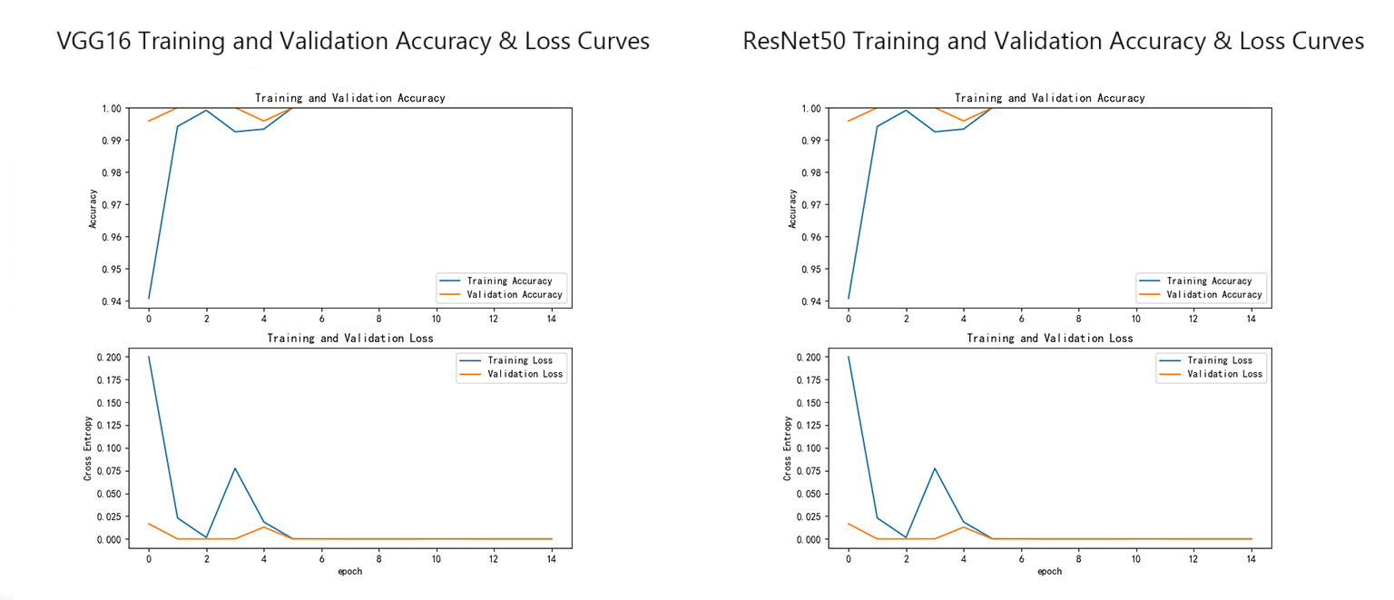 从这两张训练和验证的准确率与损失曲线图来看,ResNet50 的训练与验证准确率几乎始终保持在 99%–100% 之间,且验证损失接近 0,模型稳定性更高、泛化能力更强;而 VGG16 在前几个 epoch 虽然快速收敛,但验证曲线存在轻微波动,说明其在复杂特征提取上略逊一筹。ResNet50 在恶意软件分类任务中表现更优,具有更高的准确性和更好的收敛稳定性。