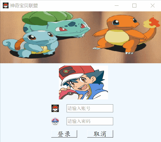 {ui->setupUi(this);//设置窗口的标题this->setWindowTitle("神奇宝贝联盟");//设置窗口的图标this->setWindowIcon(QIcon(":/picture/icon.jpg"));//设置背景颜色this->setStyleSheet("background-color:rgb(240, 248, 255)");//设置图片//用动图类 QMovie 实例化一个动图QMovie *mv = new QMovie(":/picture/baby.gif");//将动图放到标签中ui->loginLab->setMovie(mv);//让动图动起来mv->start();//图片自适应ui->loginLab->setScaledContents(true);//设置用户图片ui->userPictureLab->setPixmap(QPixmap(":/picture/xiaozhi.jpg"));//图片自适应ui->userPictureLab->setScaledContents(true);//设置占位符文本ui->userNameEdit->setPlaceholderText("请输入账号");ui->passwordEdit->setPlaceholderText("请输入密码");//设置回显模式ui->passwordEdit->setEchoMode(QLineEdit::Password);//将图片放到标签中ui->userNameLab->setPixmap(QPixmap(":/picture/icon.jpg"));//图片自适应ui->userNameLab->setScaledContents(true);//将图片放到标签中ui->passwordLab->setPixmap(QPixmap(":/picture/passwordicon.jpg!con"));//图片自适应ui->passwordLab->setScaledContents(true);