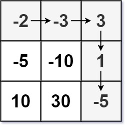 输入:dungeon = [[-2,-3,3],[-5,-10,1],[10,30,-5]] 输出:7 解释:如果骑士遵循最佳路径:右 -> 右 -> 下 -> 下 ,则骑士的初始健康点数至少为 7 。