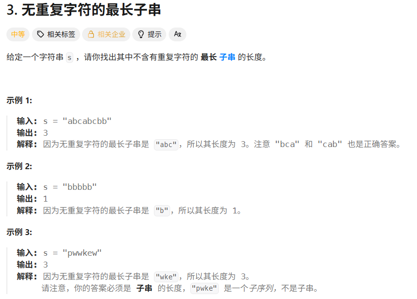 class Solution {public int lengthOfLongestSubstring(String s) {int n=s.length();int sum=0;int j=0;Set<Character>all=new HashSet<>();for (int i = 0; i < n; i++) {if(i!=0){all.remove(s.charAt(i-1));}int tsum=all.size();while(j<n&&!all.contains(s.charAt(j))){all.add(s.charAt(j));j++;tsum++;}sum=Math.max(tsum,sum);}return sum;}}