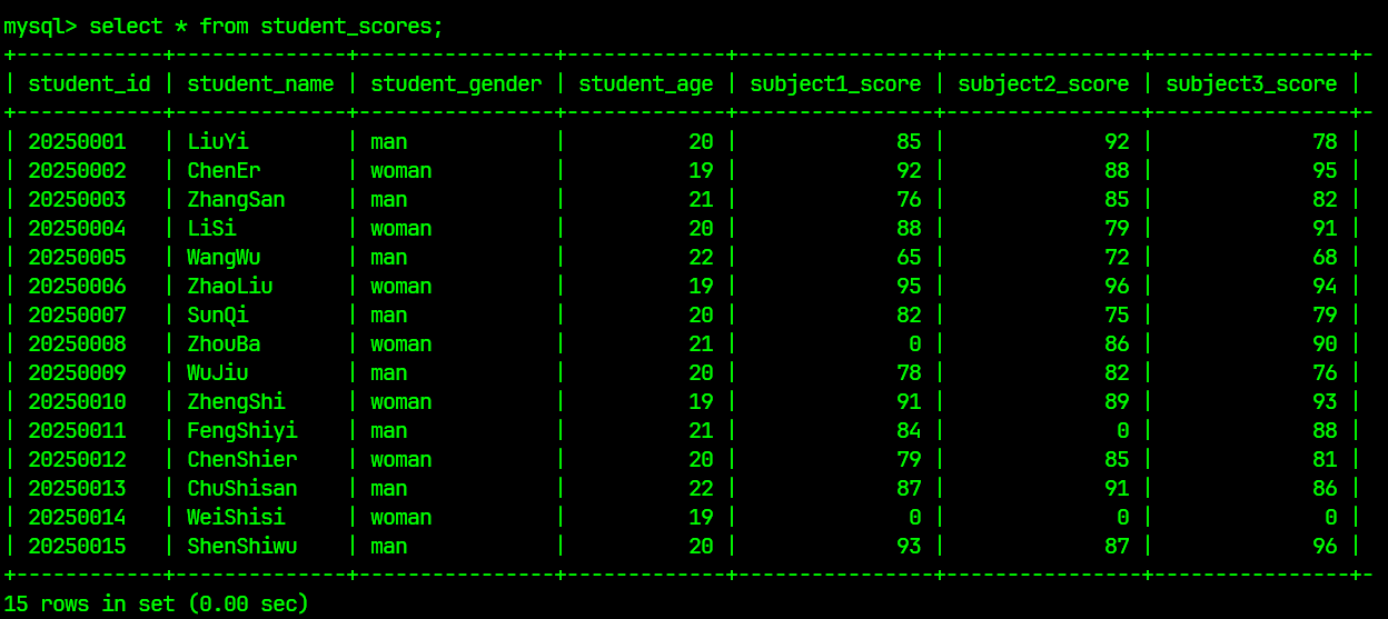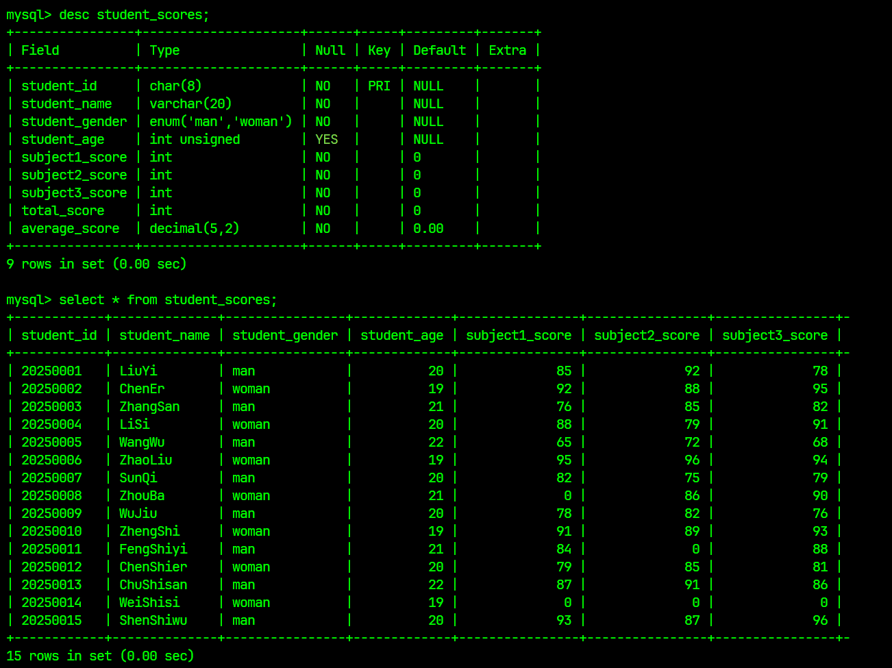 | 20250001 | LiuYi | man | 20 | 85 | 92 | 78 | 255 | 85.00 |