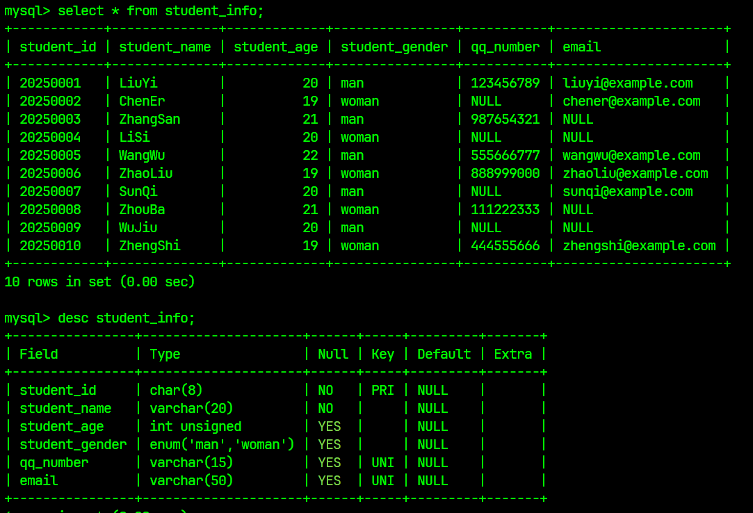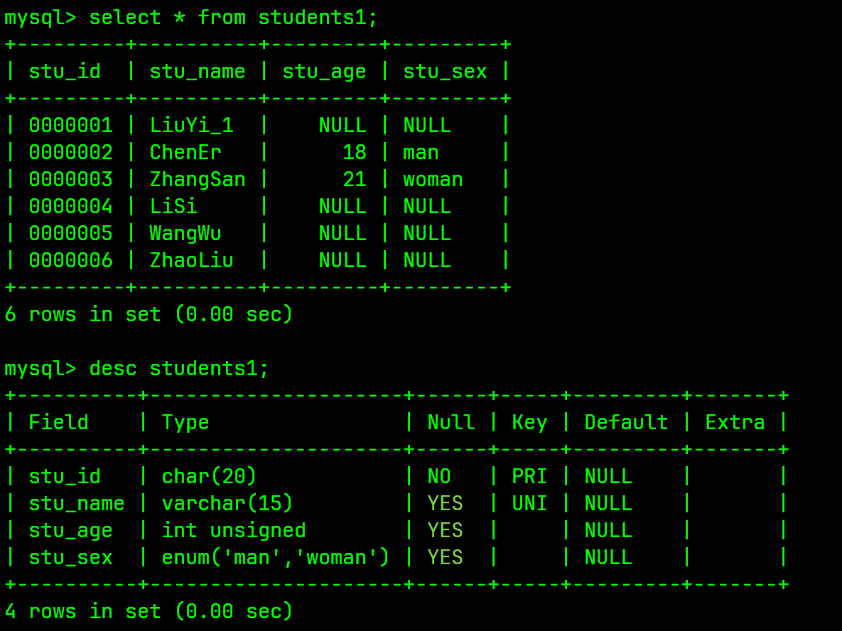 mysql> select * from students1; +---------+----------+---------+---------+ | stu_id | stu_name | stu_age | stu_sex | +---------+----------+---------+---------+ | 0000001 | LiuYi | NULL | NULL | +---------+----------+---------+---------+ 1 row in set (0.00 sec)mysql> insert into students1 # 通过省略进行全列插入-> values-> ("0000002", "ChenEr", 18, 1); Query OK, 1 row affected (0.01 sec)mysql> insert into students1 # 指定列时选择全列完成全列插入-> (stu_id, stu_name, stu_age, stu_sex)-> values-> ("0000003", "ZhangSan", 21, 2); Query OK, 1 row affected (0.00 sec)mysql> select * from students1; # 对表查询 +---------+----------+---------+---------+ | stu_id | stu_name | stu_age | stu_sex | +---------+----------+---------+---------+ | 0000001 | LiuYi | NULL | NULL | | 0000002 | ChenEr | 18 | man | | 0000003 | ZhangSan | 21 | woman | +---------+----------+---------+---------+ 3 rows in set (0.00 sec)