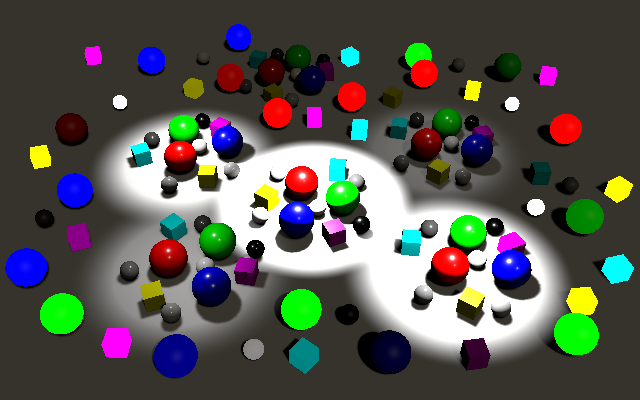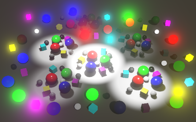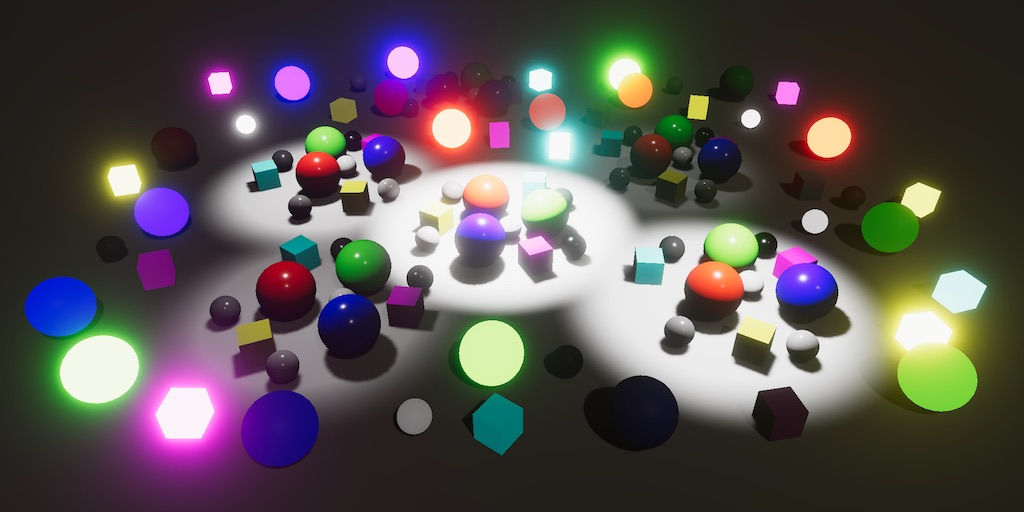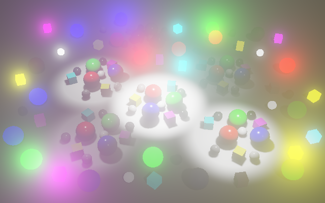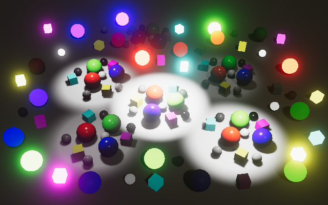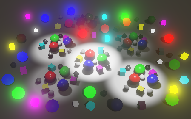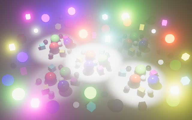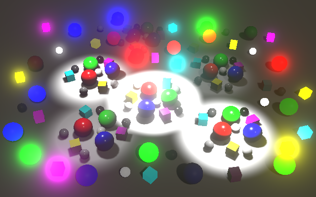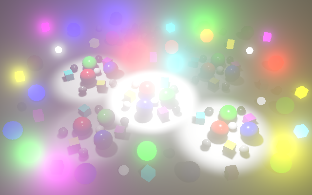 虽然我们可以使用HDR进行渲染,但常规摄像机的最终帧缓冲区始终是LDR格式。因此颜色通道会在数值1处被截断。实际上最终图像的白点就设定在1。这意味着极端明亮的颜色最终看起来与完全饱和的颜色毫无区别。例如,我创建了一个包含多级光照强度和不同自发光度物体的场景,其亮度值远超1。最强的自发光度达到8,而最亮的光源强度高达200