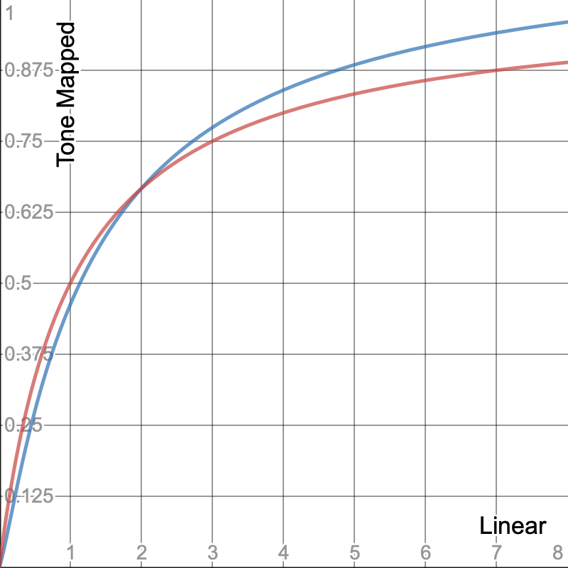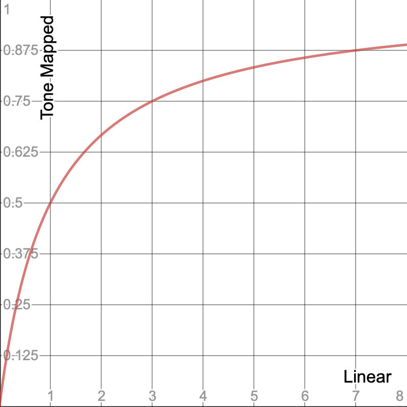 我们色调映射的目标是降低图像亮度,让原本均匀的白色区域呈现出丰富的色彩变化,从而还原原本丢失的细节。这就像人眼突然进入明亮环境时会自动调节直到重新看清物体的过程。但我们不希望整体均匀地降低亮度,因为那样会使暗部色彩难以区分,相当于用曝光不足替换了过曝问题。因此我们需要一种非线性转换:对暗值影响轻微,但对高值大幅压缩。在极端情况下,零值保持为零,趋近无穷大的值会被压缩到1。实现此功能的简单公式是c/(1+c),其中c代表颜色通道。该函数是最简形式的Reinhard色调映射运算(由Mark Reinhard最初提出),不同之处在于我们将其独立应用于每个颜色通道,而他当时是针对亮度值设计的