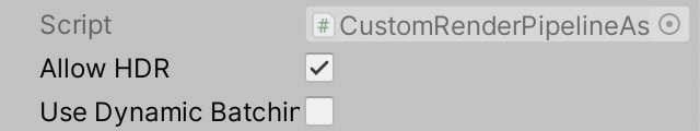 [SerializeField]bool allowHDR = true;…protected override RenderPipeline CreatePipeline () {return new CustomRenderPipeline(allowHDR, useDynamicBatching, useGPUInstancing, useSRPBatcher,useLightsPerObject, shadows, postFXSettings);}