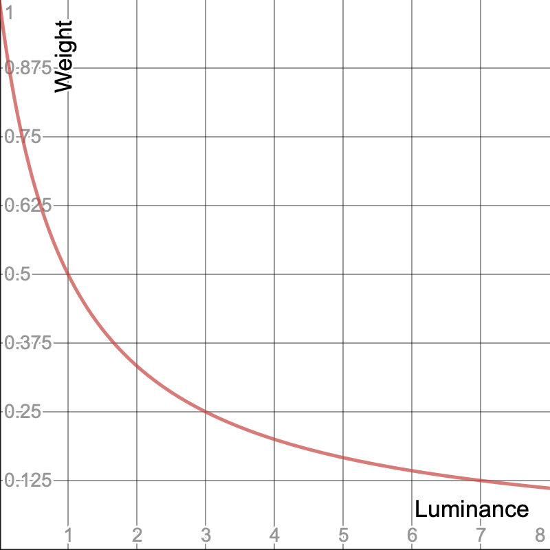 最终我们将样本总和除以这些权重之和。这实际上将萤火虫噪点的亮度扩散到所有其他样本中。如果其他样本较暗,萤火虫噪点就会淡化。例如,0、0、0和10的加权平均值为