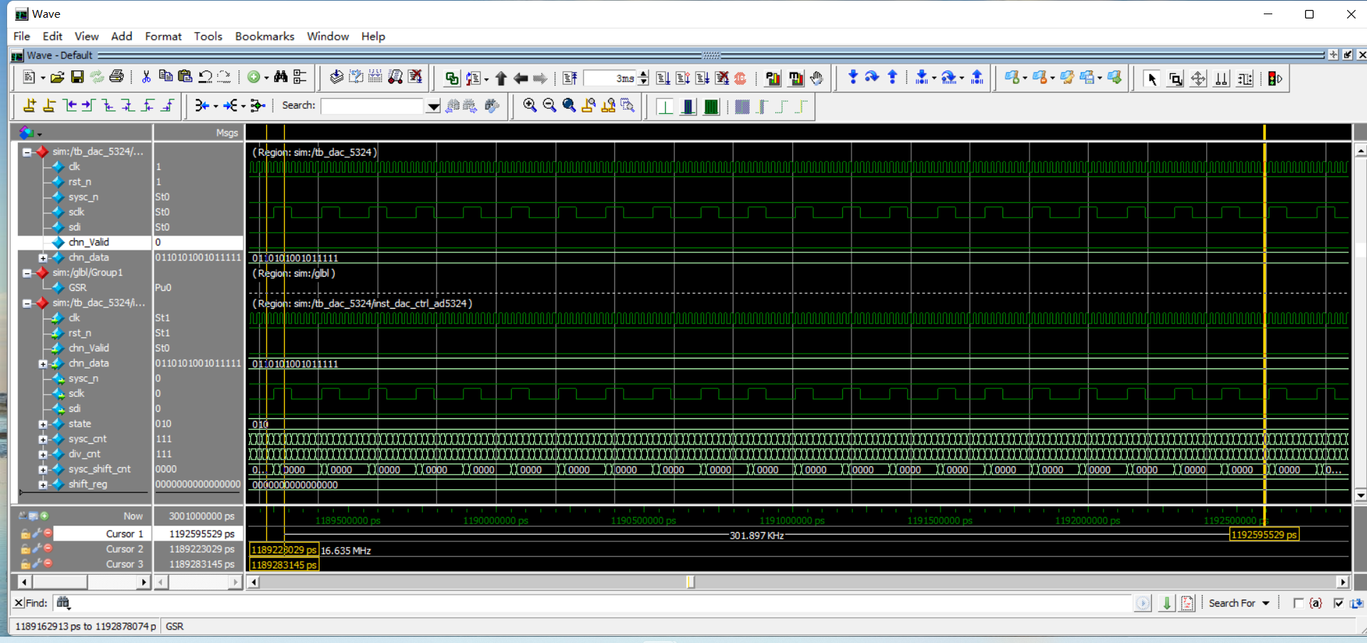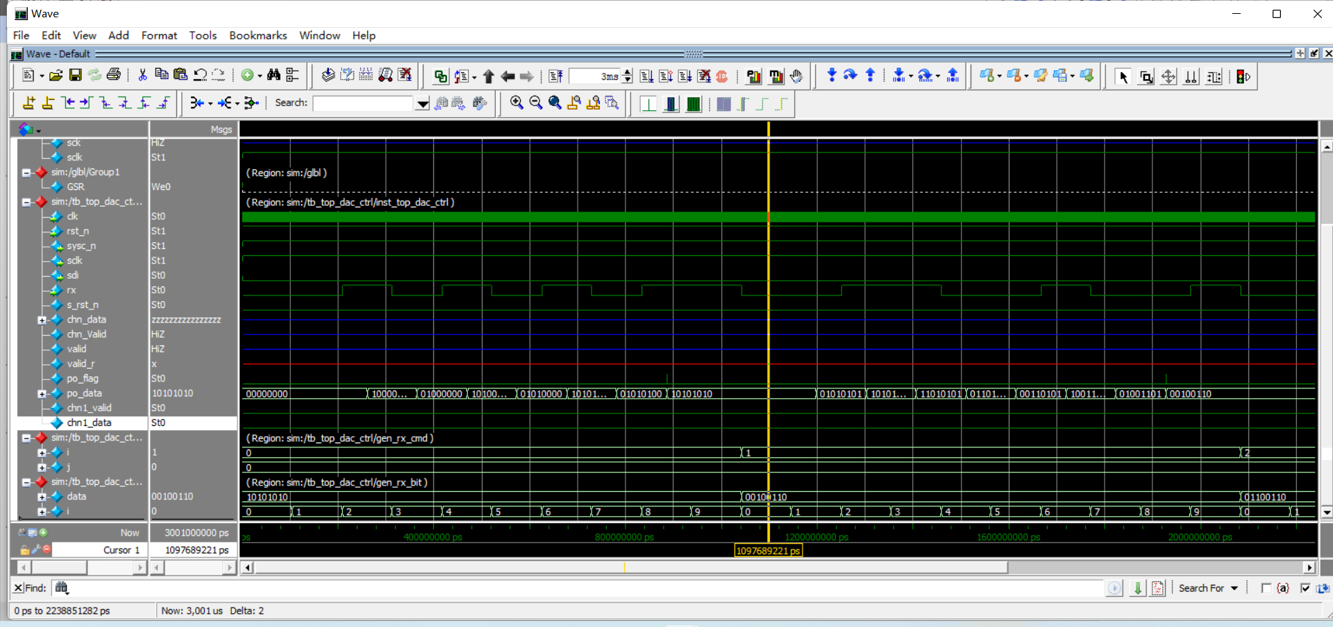 `timescale 1ns/1psmodule top_dac_ctrl(input wire clk,input wire rst_n,// input wire chn_Valid,// input wire [15:0] chn_data, //(A0, A1, LDAC, DATA[11:0])//SPI DAC masteroutput wire sysc_n,output wire sclk,output wire sdi,//uartinput wire rx);wire s_rst_n;