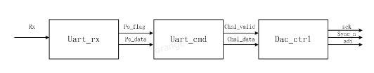 wire[7:0] po_data;reset_gen reset_gen_inst (.clk(clk), .rst_n(rst_n), .s_rst_n(s_rst_n));dac_ctrl_ad5324 dac_ctrl_ad5324_inst(.clk (clk),.rst_n (s_rst_n),.chn_Valid (chn_Valid),.chn_data (chn_data),.sysc_n (sysc_n),.sclk (sclk),.sdi (sdi));ila_top ila_top_inst (.clk(clk), // input wire clk.probe0({sysc_n,sclk,sdi,chn_data,chn_Valid}) // input wire [23:0] probe0);// vio_top vio_top_inst (// .clk(clk), // input wire clk// .probe_out0(valid), // output wire [0 : 0] probe_out0// .probe_out1(chn_data) // output wire [15 : 0] probe_out1// );uart_cmd inst_uart_cmd(.clk (clk),.rst_n (rst_n),.pi_flag (po_flag),.pi_data (po_data),.chn1_valid (chn1_valid),.chn1_data (chn1_data));uart_rx #(.CNT_BAUD_MAX(5208),.CNT_HALF_BAUD_MAX(2603)) inst_uart_rx (.clk (clk),.rst_n (rst_n),.rx (rx),.po_data (po_data),.po_flag (po_flag));// always @(posedge clk ) begin