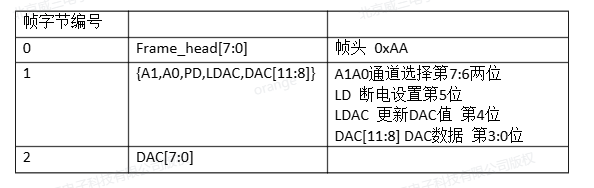 那么A1和A0位设置为0、0。PD和LDAC固定为1、0。12位的数据位按照以上公式可以计算:1.6=2.5*D/2^12。计算结果D=2621.44,取近似值2621,用二进制表示为1010_0011_1101。那么串口发送的第一个字节为AA指令,第二字节的最低两位为00,第三字节中的高4位为1010,第四字节为0011_1101。这四个字节用8进制数可以表示为AA 00 A0 3D。