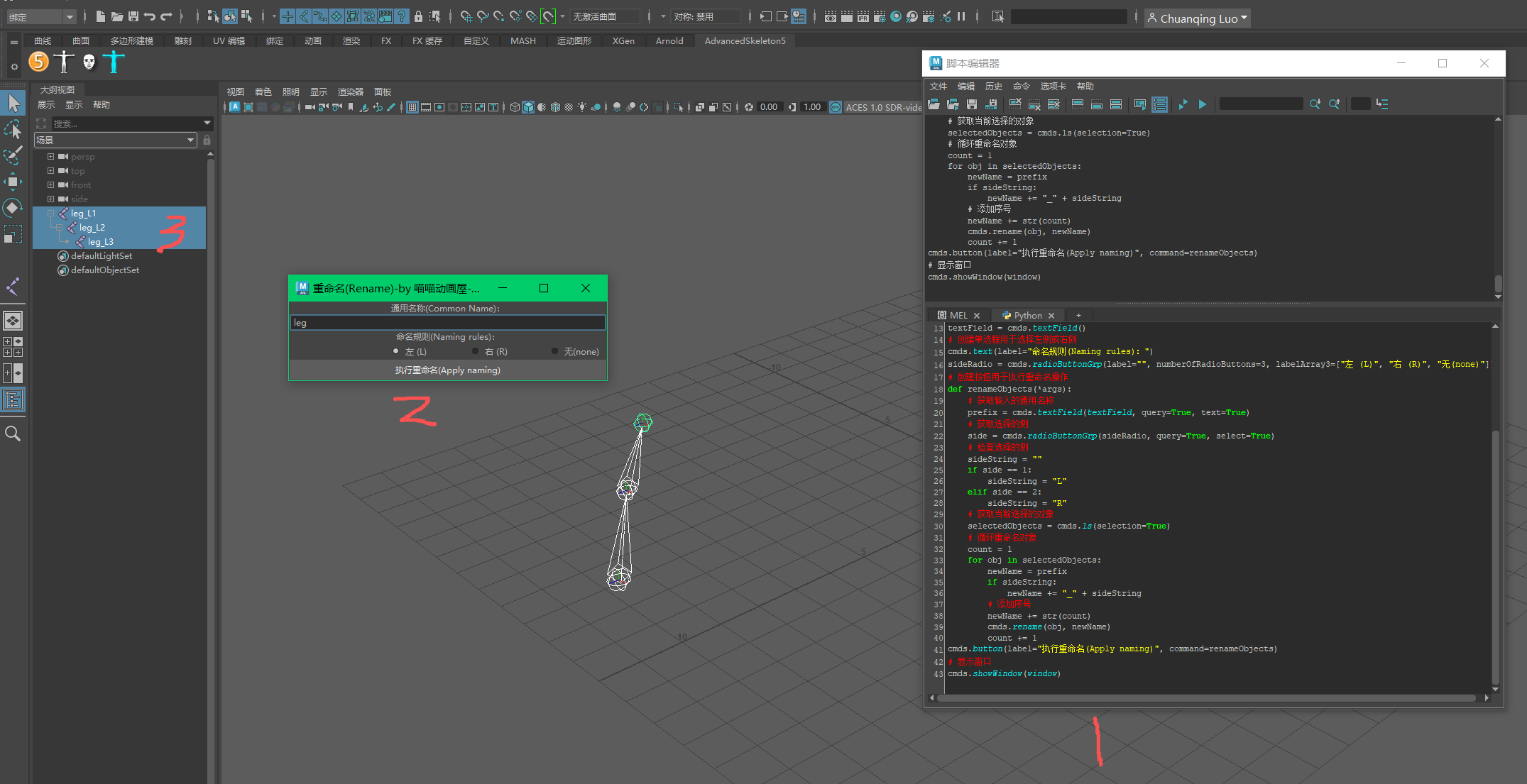 def renameObjects(*args):# 获取输入的通用名称prefix = cmds.textField(textField, query=True, text=True)# 获取选择的侧side = cmds.radioButtonGrp(sideRadio, query=True, select=True)# 检查选择的侧sideString = ""if side == 1:sideString = "L"elif side == 2:sideString = "R"# 获取当前选择的对象selectedObjects = cmds.ls(selection=True)# 循环重命名对象count = 1for obj in selectedObjects:newName = prefixif sideString:newName += "_" + sideString# 添加序号newName += str(count)cmds.rename(obj, newName)count += 1