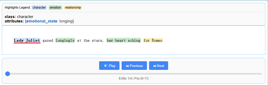 input_text = "Lady Juliet gazed longingly at the stars, her heart aching for Romeo"# Run the extraction