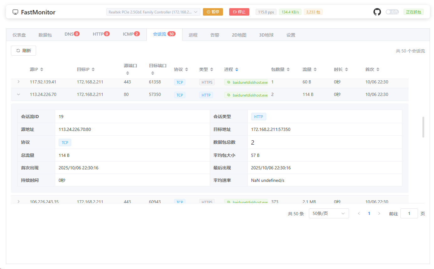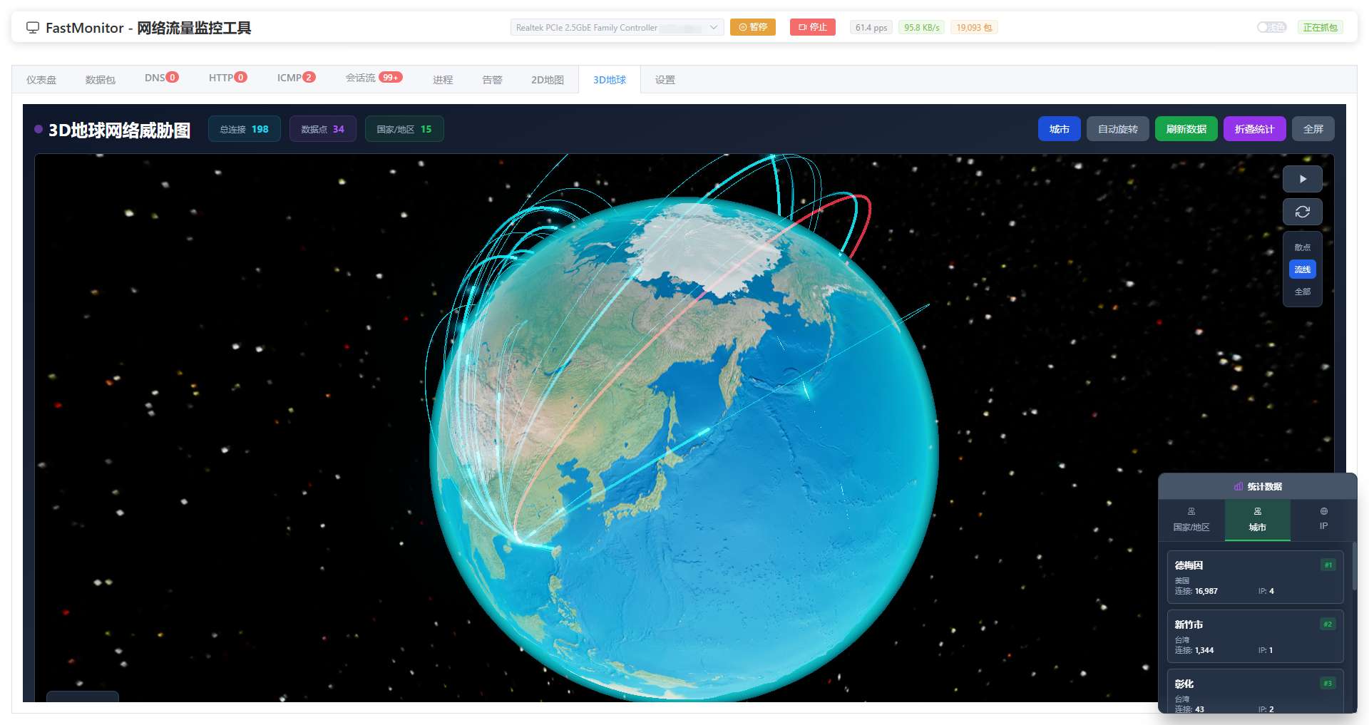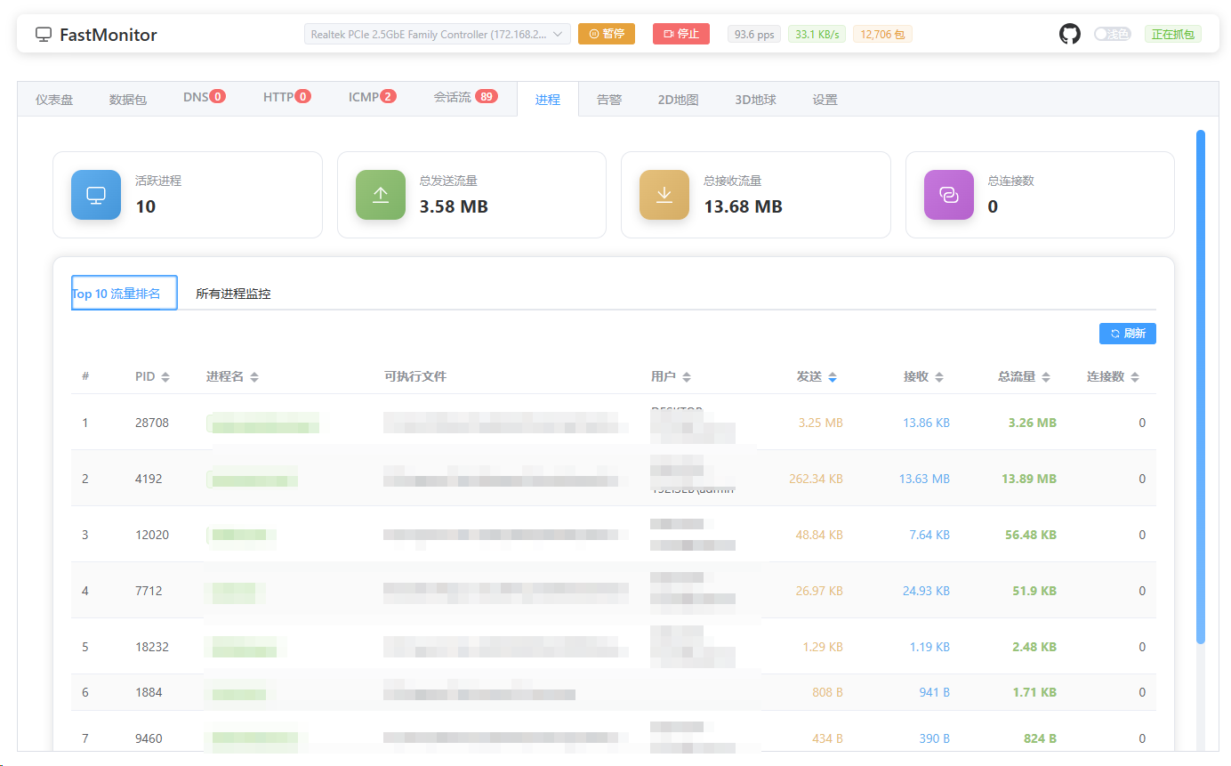 FastMonitor 是一款基于 Wails 框架开发开源的跨平台网络流量监控与威胁检测工具,集成了数据包分析、进程关联、会话流统计、威胁情报检测、地理位置可视化等功能于一体。