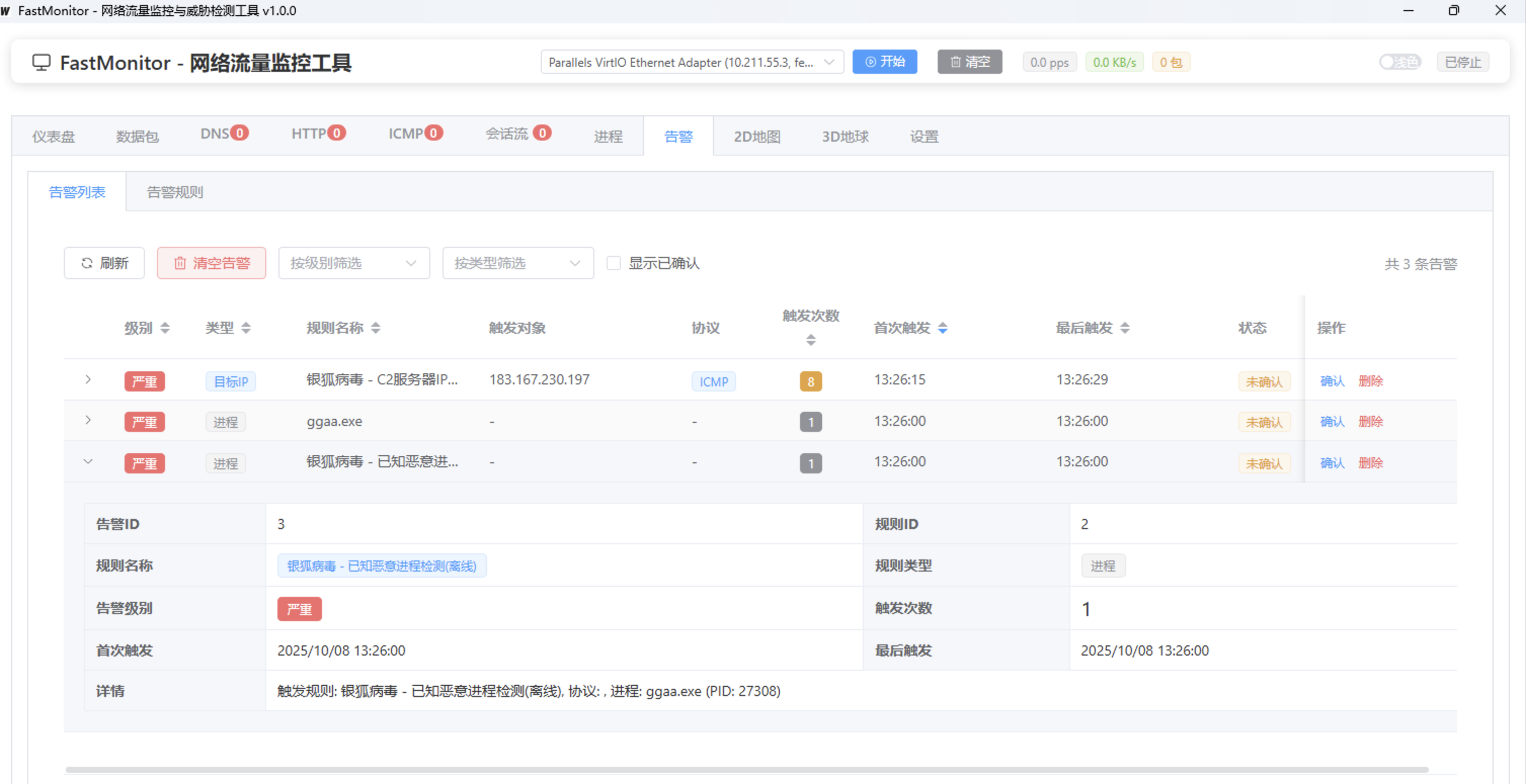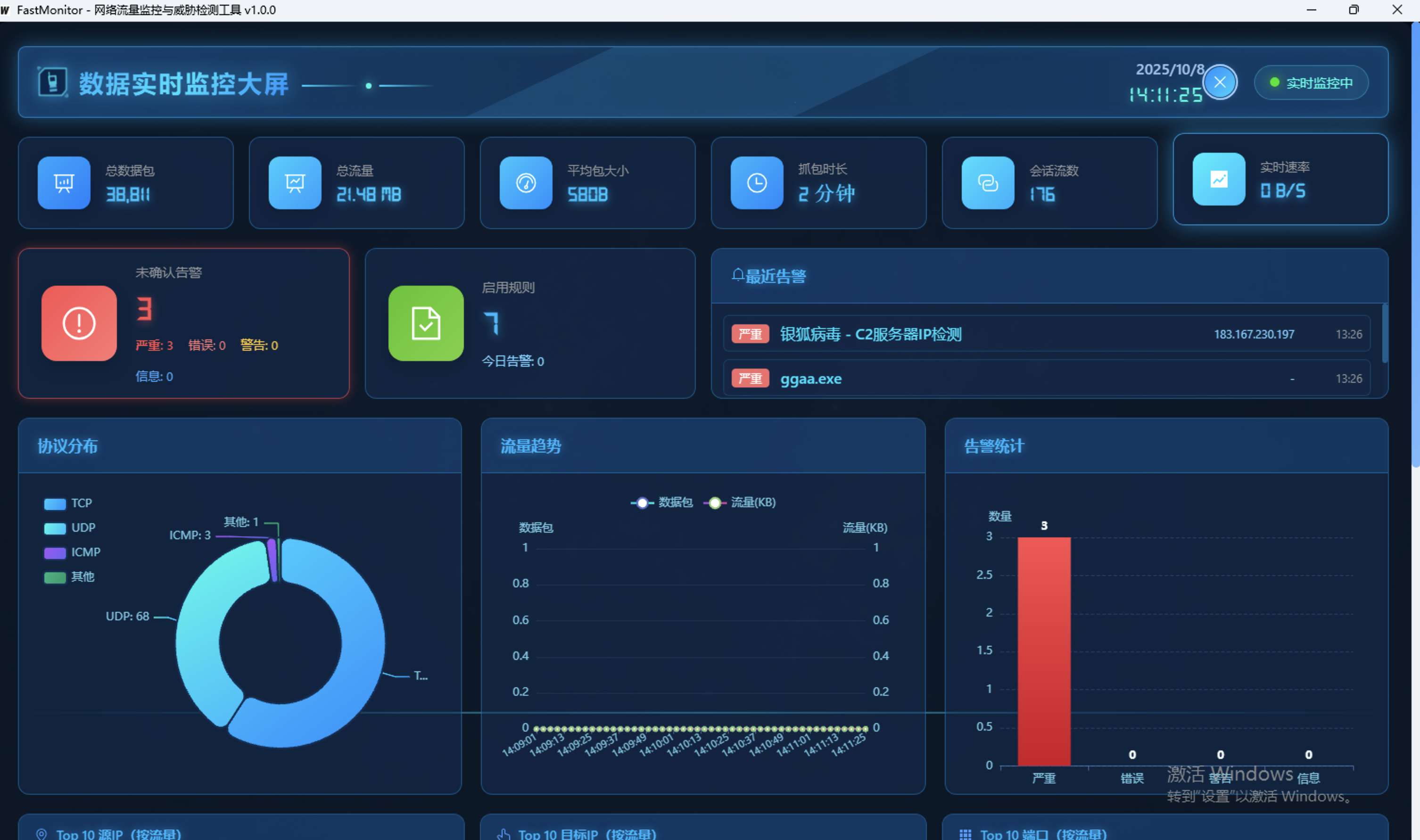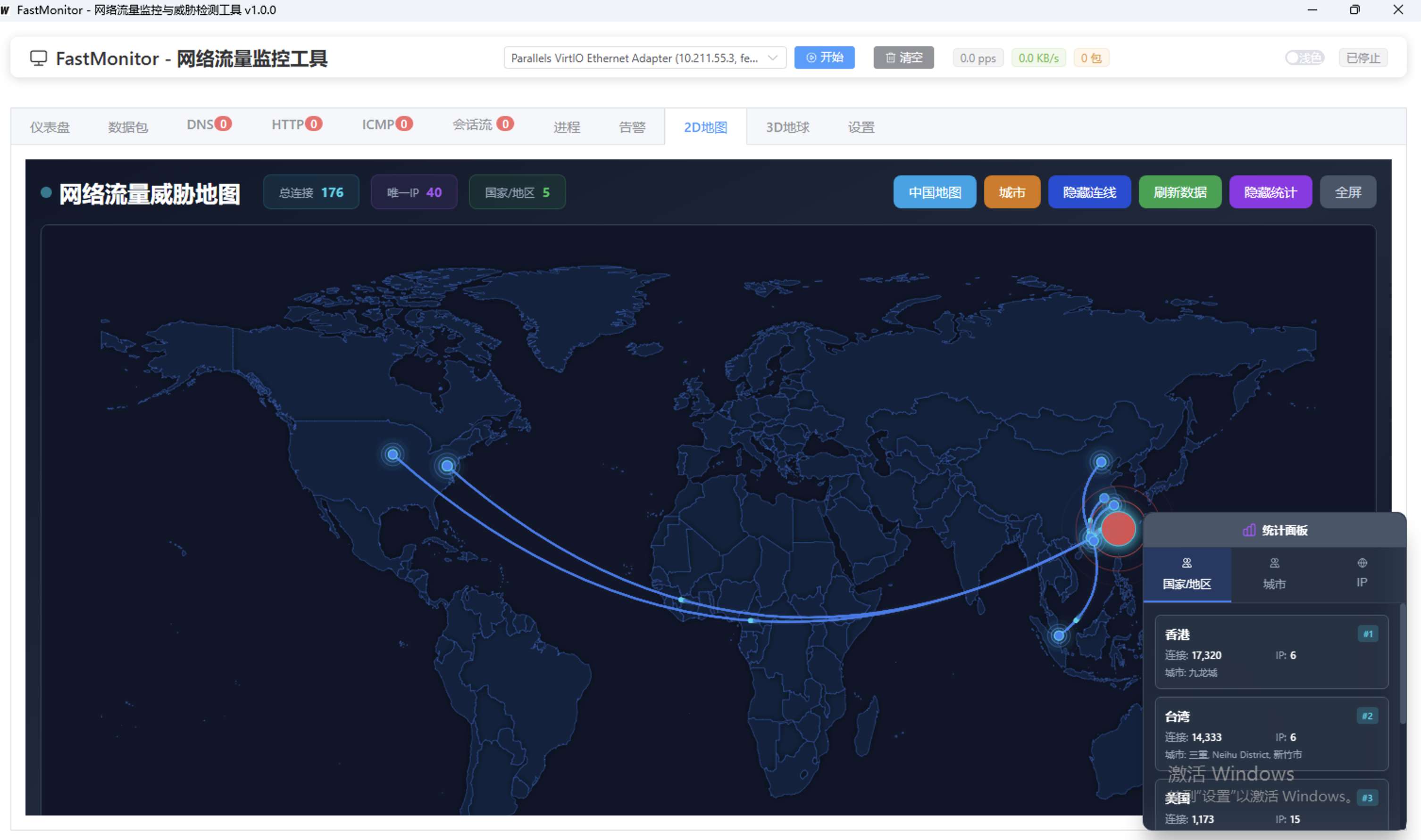 FastMonitor 是一款基于 Wails 框架开发开源的跨平台网络流量监控与威胁检测工具,集成了数据包分析、进程关联、会话流统计、威胁情报检测、地理位置可视化等功能于一体。