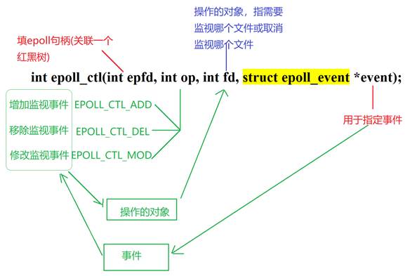 函数原型:int epoll_ctl(int epfd, int op, int fd, struct epoll_event *event);