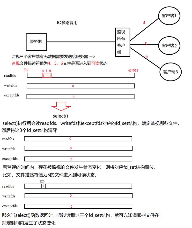 备注:select()函数执行时,将根据readfds、writefds、exceptfds指向的3个fd_set结构中哪些位被置位,来让系统内核监视相应的文件是否进入到对应的状态。之后再自动将readfds、writefds、exceptfds指向的3个fd_set结构先清零,若对应的文件在监视时间内发生了指定的状态变化,则自动将对应fd_set相应位置位typedef __kernel_fd_set fd_set;