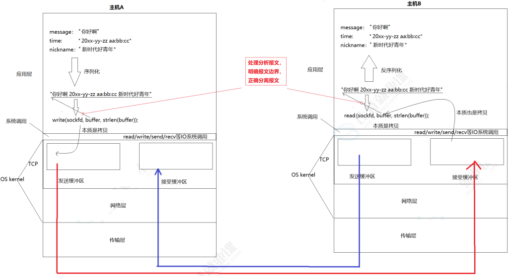 我们不推荐直接向网络中发送结构体类型的变量,因为客户端和服务端不一定在同一个OS系统中,会导致结构体的内存对齐不一样,导致大小不一样,以及大小端差异的问题,跨平台性太差!所以我们采用对发送出去的结构体进行序列化,对接收到的结构体进行反序列化的做法,来消除对端的平台差异!