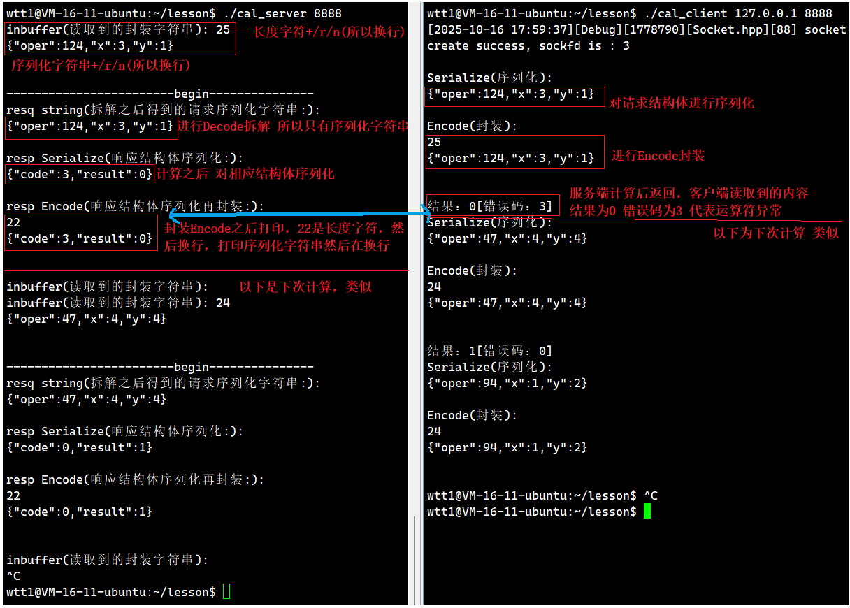 {// 声明分隔符 为 "\r\n"const std::string SEP = "\r\n";// Encode--->对已经序列化之后的json_str 进行封装// 使其成为 "len"\r\n"{json_str}"\r\n 的样式std::string Encode(const std::string &json_str){// 第1步:计算原始JSON数据的长度int json_str_len = json_str.size();// 假设 json_str = "{\"x\":5,\"y\":3}",那么 json_str_len = 13// 第2步:将长度转换为字符串std::string proto_str = std::to_string(json_str_len);// 现在 proto_str = "13" (字符串形式)// 第3步:添加第一个分隔符proto_str += SEP; // SEP = "\r\n"// 现在 proto_str = "13\r\n"// 第4步:添加原始的JSON数据proto_str += json_str;// 现在 proto_str = "13\r\n{\"x\":5,\"y\":3}"// 第5步:添加结尾分隔符proto_str += SEP; // 再次添加 "\r\n"// 最终 proto_str = "13\r\n{\"x\":5,\"y\":3}\r\n"return proto_str;}// Decode--->对已经被封装之后的序列化的字符串inbuffer 进行拆解// 单独获取其中的有效载荷,也就是序列化字符串std::string Decode(std::string &inbuffer){// 第1步:查找第一个分隔符,pos定位到长度字段的结束位置auto pos = inbuffer.find(SEP); // SEP = "\r\n"if (pos == std::string::npos)return std::string(); // 没有找到分隔符,数据不完整 直接返回空字符串// 第2步:提取长度字段(第一个分隔符之前的部分)std::string len_str = inbuffer.substr(0, pos);if (len_str.empty())return std::string(); // 发现长度字段为空,协议格式错误// 第3步:将长度字符串转换为整数int packlen = std::stoi(len_str); // 得到序列化字符串的长度// 第4步:计算整个报文的总长度// 总长度 = 长度字段 + 分隔符 + JSON数据 + 分隔符int total = packlen + len_str.size() + 2 * SEP.size();if (inbuffer.size() < total) // 发现本次接收到的数据不是一个完整的报文,意味着缓冲区数据不足,需要等待下一次的报文去+=到本次不完整的报文的后面return std::string(); // 则返回空字符串// 第5步:提取JSON数据部分std::string package = inbuffer.substr(pos + SEP.size(), packlen);// 第6步:从缓冲区移除已处理的数据inbuffer.erase(0, total);return package;// 所以 但凡报文不完整则一律返回空字符串 只有完整才会返回JSON部分// 所以 调用该接口的 通过返回值即可判断是否完整}// Request请求类// 客户端使用该类 会生成请求类的对象// 类中有左计算数 计算符 右操作数// 一个类就是一个计算请求class Request{public:Request() // 无参构造{}Request(int x, int y, char oper) : _x(x), _y(y), _oper(oper) // 有参构造{}// Serialize-->序列化// 将结构体转换为JSON字符串// 写法是Json其中的一种 这是固定的写法bool Serialize(std::string *out){Json::Value root; // 创建JSON值的根对象// 将结构体成员填充到JSON对象中// 这相当于创建:{"x": 值, "y": 值, "oper": 值}root["x"] = _x; // 自动将int转换为JSON数值root["y"] = _y;root["oper"] = _oper; // char会自动转换为JSON数值(ASCII码)Json::FastWriter writer; // 创建JSON写入器// 将JSON对象转换为字符串 写入到*out中 此时的*out就是一个将结构体序列化之后得到的字符串*out = writer.write(root);return true;}// Deserialize-->反序列化// 把JSON字符串转化为结构体bool Deserialize(const std::string &in){// 代码同理Json::Value root; // 创建JSON根对象Json::Reader reader; // 创建JSON解析器// 解析JSON字符串bool res = reader.parse(in, root);if (!res)return false; // 解析失败// 复原到结构体_x = root["x"].asInt(); // 从JSON数值转换为int_y = root["y"].asInt(); // 从JSON数值转换为int_oper = root["oper"].asInt(); // 从JSON数值转换为int 字符本质也是整形intreturn true;}public:int _x; // 左计算数int _y; // 右计算数char _oper; // 运算符号};// Response响应类// 表示服务端返回的计算结果 服务端计算完成之后 返回该类的对象// 该类包含计算接口和错误码两个成员变量class Response{public:Response() // 无参构造{}Response(int result, int code) : _result(result), _code(code) // 有参构造{}// 同理序列化bool Serialize(std::string *out){// 转换成为字符串Json::Value root;root["result"] = _result;root["code"] = _code;Json::FastWriter writer;// Json::StyledWriter writer;*out = writer.write(root);return true;}// 同理反序列化bool Deserialize(const std::string &in){Json::Value root;Json::Reader reader;bool res = reader.parse(in, root);if (!res)return false;_result = root["result"].asInt();_code = root["code"].asInt();return true;}public:int _result; // 结果int _code; // 用于表示结果的可宝兴 0:可报 1: 除0错误 2: 非法操作(符号不属于运算符等)};// Factory工厂类// 客户端调用以便于生成请求类 && 服务端调用以便于生成响应类// 所以采用随机数原则 来生成不同的式子class Factory{public:Factory() // 构造函数{srand(time(nullptr) ^ getpid()); // 随机数种子opers = "+-*/%^&|"; // 符号字符数组}// 创建请求// 随机生成计算表达式std::shared_ptr<Request> BuildRequest() // 返回值为Request请求类类型的指针{int x = rand() % 10 + 1; // 生成[0,1,2,3,4,5,6,7,8,9,10]中随机的左计算数usleep(x * 10);int y = rand() % 5; // 生成[0,1,2,3,4]中随机的左计算数usleep(y * x * 5);char oper = opers[rand() % opers.size()]; // 生成"+-*/%^&|"中随时的运算符号 特意包含错误运算符 体现响应类错误码的作用std::shared_ptr<Request> req = std::make_shared<Request>(x, y, oper);//创建请求类对象 将三个随机数据填入return req;}// 创建响应// 根据客户端发来的随机计算式 生成响应std::shared_ptr<Response> BuildResponse() // 返回值为Response响应类类型的指针{return std::make_shared<Response>();}~Factory(){}private:std::string opers; //符号字符数组 };