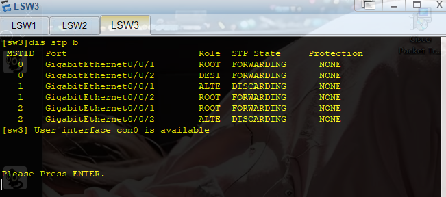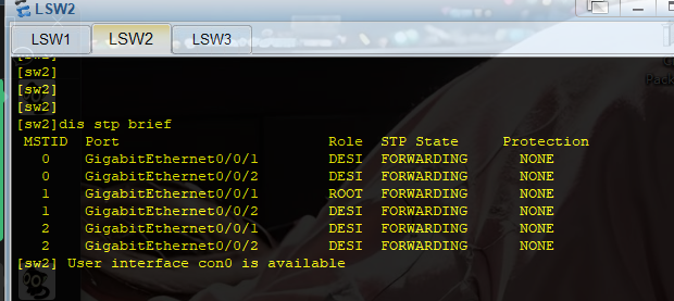 stp instance 1 root secondary #在实例1中将sw2设置为备份根stp instance 2 root primary #在实例2中,将sw2设置为根桥在SW2