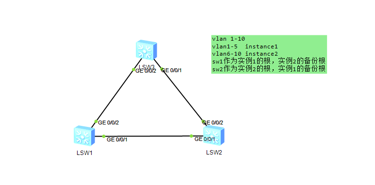 因为MSTP域中要求相同的域名、修订等级、相同的实例和vlan对应关系,SW1~3配置内容大部分基本一致(以下为SW1~3相同部分的命令)int g0/0/1 #进入接口视图(每一个接口都要配置)port link-type trunk #修改接口模式为trunkport trunk allow-pass all #允许所有vlan通过trunksystem-view # 进入系统视图stp mode mstp # 开启MSTP协议stp region-configuration # 创建MST域,名称自定义为 zhangsan(可按需修改),修订级别为1region-name zhangsanrevision-level 1instance 1 vlan 1 to 5 # 将VLAN 1-5映射到实例1instance 2 vlan 6 to 10 # 将VLAN 6-10映射到实例2active region-configuration # 激活MST域配置quit #回到系统视局回到系统视局后完成要求: