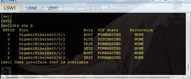 stp instance 1 root primary #在实例1中将sw1设置为备份根stp instance 2 root secondary #在实例2中,将sw1设置为根桥