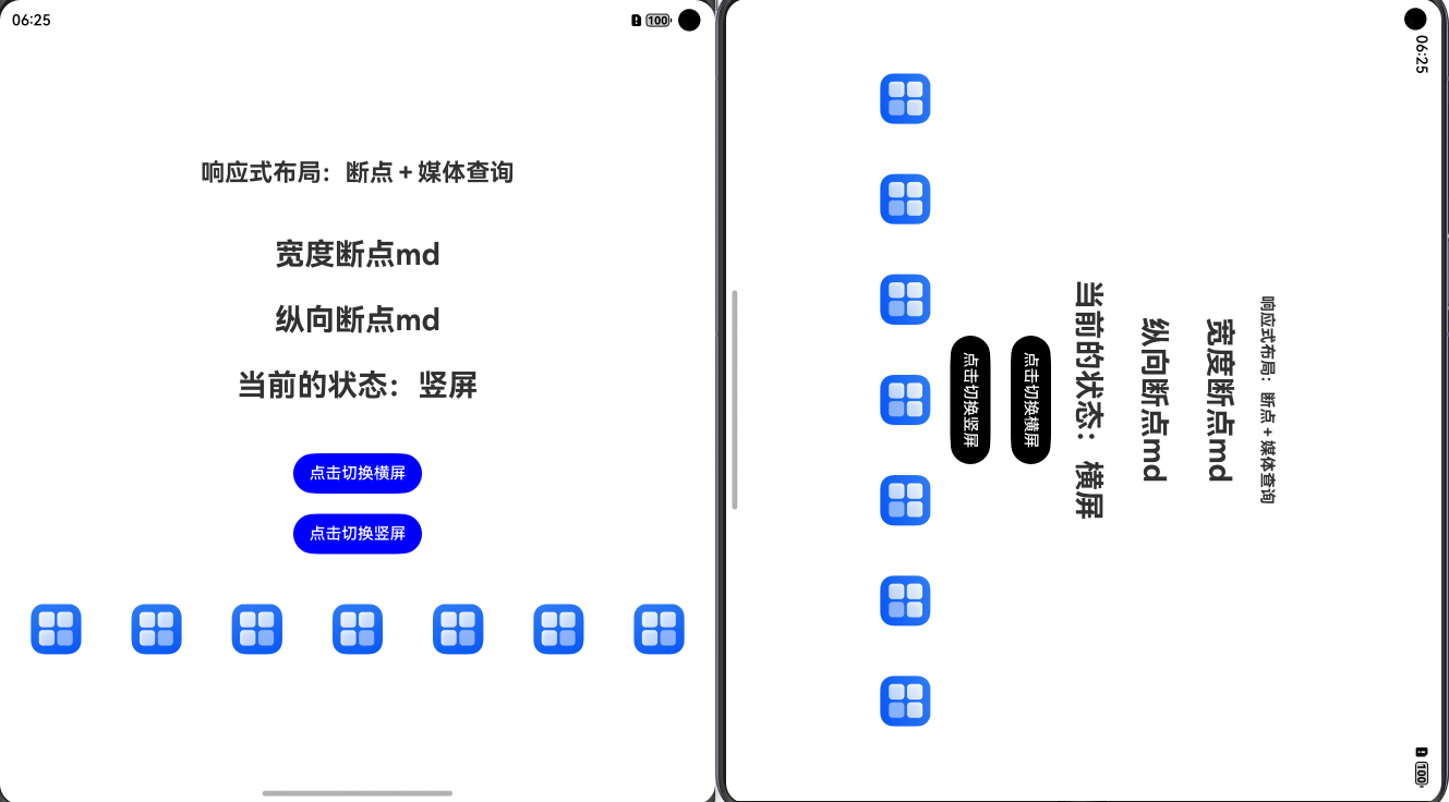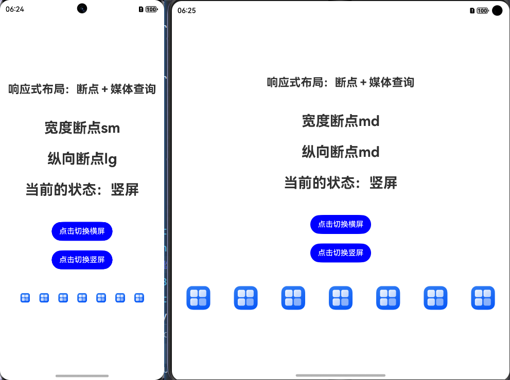 struct Index {@Local currentState: string = ""listener: mediaquery.MediaQueryListener =this.getUIContext().getMediaQuery().matchMediaSync('(orientation: landscape)');// 获取当前应用的UIAbility上下文context = this.getUIContext().getHostContext()!;@Local widthBreakpoint: BreakpointType = "xs"@Local heightBreakpoint: BreakpointType = "xs"aboutToAppear(): void {// 监听屏幕方向改变this.getCurrentOrientation()}// 获取屏幕纵向断点strgetHeightBreakpointStr() {// HEIGHT_SM 0 窗口高宽比小于0.8。// HEIGHT_MD 1 窗口高宽比大于等于0.8,且小于1.2。// HEIGHT_LG 2 窗口高宽比大于等于1.2。const heightBreakpoint = this.getUIContext().getWindowHeightBreakpoint()console.info(` heightBreakpoint: ${heightBreakpoint}`);switch (heightBreakpoint) {case 0:this.heightBreakpoint = "sm"break;case 1:this.heightBreakpoint = "md"break;case 2:this.heightBreakpoint = "lg"break;default:break;}this.heightBreakpoint}// 获取屏幕横向断点strgetWidthBreakpointStr() {// 获取当前实例所在窗口的宽度断点枚举值// WIDTH_XS 0 窗口宽度小于320vp。// WIDTH_SM 1 窗口宽度大于等于320vp,且小于600vp。// WIDTH_MD 2 窗口宽度大于等于600vp,且小于840vp。// WIDTH_LG 3 窗口宽度大于等于840vp,且小于1440vp。// WIDTH_XL 4 窗口宽度大于等于1440vp。const widthBreakpoint = this.getUIContext().getWindowWidthBreakpoint()console.info(` widthBreakpoint: ${widthBreakpoint}`);switch (widthBreakpoint) {case 0:this.widthBreakpoint = "xs"break;case 1:this.widthBreakpoint = "sm"break;case 2:this.widthBreakpoint = "md"break;case 3:this.widthBreakpoint = "lg"break;case 4:this.widthBreakpoint = "xl"break;default:break;}}/// 获取当前方向状态getCurrentOrientation() {this.listener.on('change', (mediaQueryResult: mediaquery.MediaQueryResult) => {console.log("监听结果" + mediaQueryResult.media)this.getWidthBreakpointStr()this.getHeightBreakpointStr()if (mediaQueryResult.matches) {this.currentState = "横屏"} else {this.currentState = "竖屏"}});}/// 切换横屏switchToLandscape() {// 获取应用的最后一个窗口实例window.getLastWindow(this.context).then((lastWindow) => {// 根据参数设置窗口首选方向:横屏lastWindow.setPreferredOrientation(window.Orientation.LANDSCAPE)});}/// 切换竖屏switchToPortrait() {// 获取应用的最后一个窗口实例window.getLastWindow(this.context).then((lastWindow) => {// 根据参数设置窗口首选方向:竖屏lastWindow.setPreferredOrientation(window.Orientation.PORTRAIT)});}build() {Column({ space: this.currentState == "横屏" ? 20 : 50 }) {Text("响应式布局:断点+媒体查询").fontSize(this.currentState == "横屏" ? 16 : 24).fontWeight(FontWeight.Bold)Column({ space: 30 }) {Text("宽度断点" + this.widthBreakpoint).fontSize(30).fontWeight(FontWeight.Bold)Text("纵向断点" + this.heightBreakpoint).fontSize(30).fontWeight(FontWeight.Bold)Text("当前的状态:" + this.currentState).fontSize(30).fontWeight(FontWeight.Bold)}Column({ space: 20 }) {Button("点击切换横屏").onClick(() => {this.switchToLandscape()}).backgroundColor(this.currentState == "横屏" ? Color.Black : Color.Blue)Button("点击切换竖屏").onClick(() => {this.switchToPortrait()}).backgroundColor(this.currentState == "横屏" ? Color.Black : Color.Blue)}Row({ space: this.widthBreakpoint == "sm" ? 20 : 50 }) {Image($r('app.media.startIcon')).width(this.widthBreakpoint == "sm" ? 20 : 50)Image($r('app.media.startIcon')).width(this.widthBreakpoint == "sm" ? 20 : 50)Image($r('app.media.startIcon')).width(this.widthBreakpoint == "sm" ? 20 : 50)Image($r('app.media.startIcon')).width(this.widthBreakpoint == "sm" ? 20 : 50)Image($r('app.media.startIcon')).width(this.widthBreakpoint == "sm" ? 20 : 50)Image($r('app.media.startIcon')).width(this.widthBreakpoint == "sm" ? 20 : 50)Image($r('app.media.startIcon')).width(this.widthBreakpoint == "sm" ? 20 : 50)}.justifyContent(FlexAlign.Center).width("100%")}.justifyContent(FlexAlign.Center).width("100%").height("100%")}