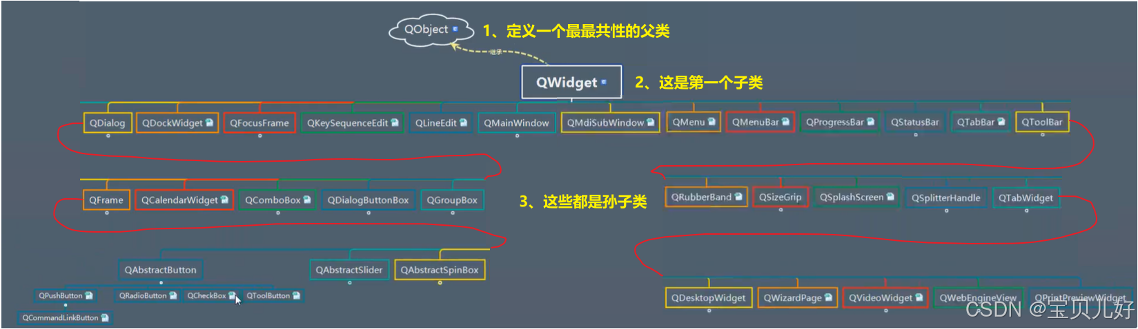 可见PyQt5库是一层层抽取共性,被抽取的共性打包成一个子类,这个子类继承它前面的大类。所以我们可以看到PyQt5库的类是如下结构: