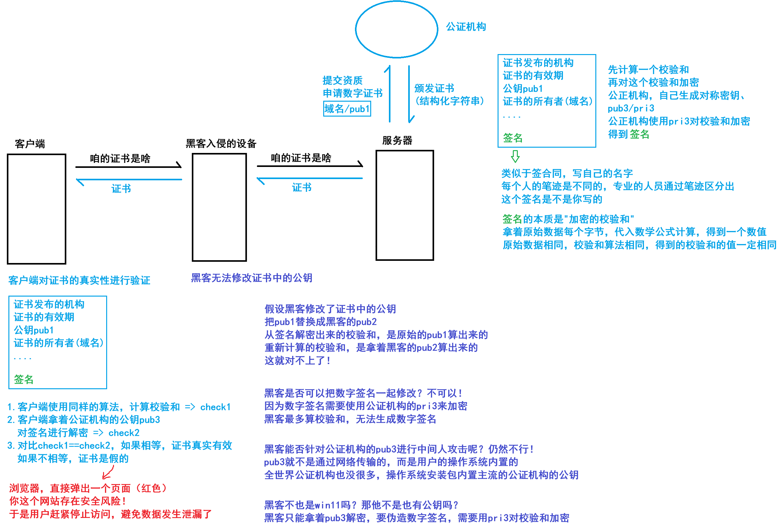 安装 Fiddler 的时候,要安装证书。Fiddler 抓取 https 的时候,就是在进行中间人攻击,需要你信任 Fiddler 的证书,信任了 Fiddler 的公钥。Fiddler 把证书中的 pub1 和数字签名都替换了,使用自己的私钥,对校验和加密。信任 Fiddler 的证书,安装了 Fiddler 的公钥,Fiddler 就也是 "公证机构",客户端对 Fiddler 的数据进行验证的时候,使用 Fiddler 的公钥解密数字签名。