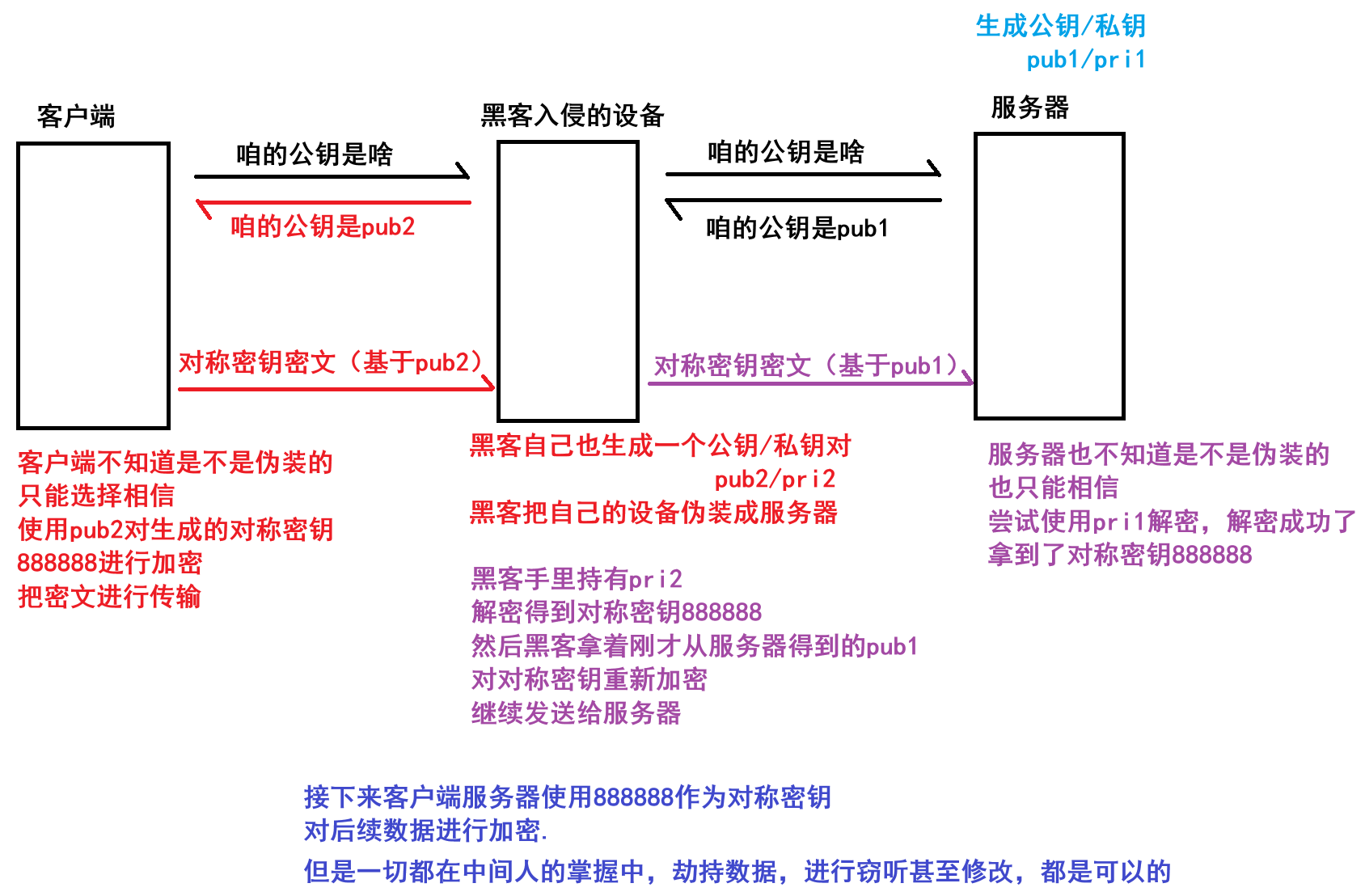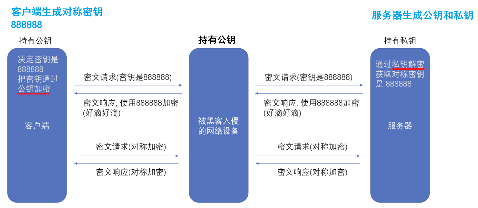 黑客入侵的设备,即使拿到了数据,也无法解密,也就无法获取到对称密钥。因为它手里只有公钥,没有私钥。公钥是一把锁头(给谁都行),私钥是对应的钥匙。后续客户端和服务器都只用对称加密即可,由于该对称密钥只有客户端和服务器两个主机知道,其他主机/设备不知道密钥,即使截获数据也没有意义。注:服务器两次生成的公钥私钥,是不同的,随机的。
