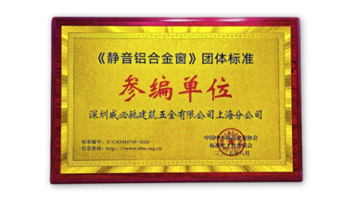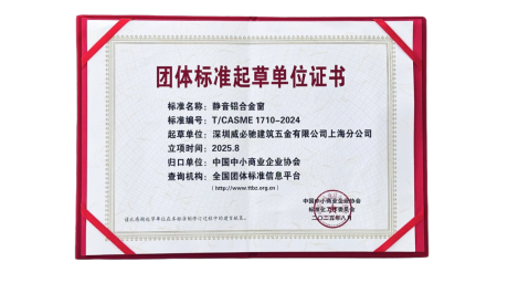 2025年,威必驰凭借在静音建筑五金领域的深厚技术积淀与行业影响力,成功成为《静音铝合金窗》团体标准(标准编号:T/CASME 1710-2024)的参编单位。这一身份不仅是行业对威必驰技术实力的高度认可,更标志着威必驰从“产品创新”向“标准引领”进阶,为静音铝合金窗领域的规范化、专业化发展注入核心力量。