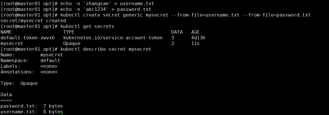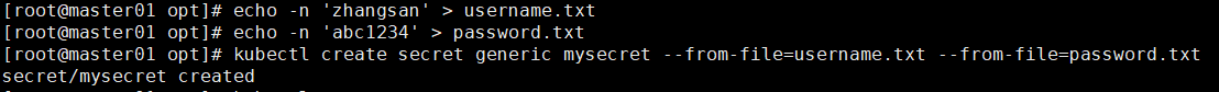 echo -n 'abc1234' > password.txtkubectl create secret generic mysecret --from-file=username.txt --from-file=password.txt