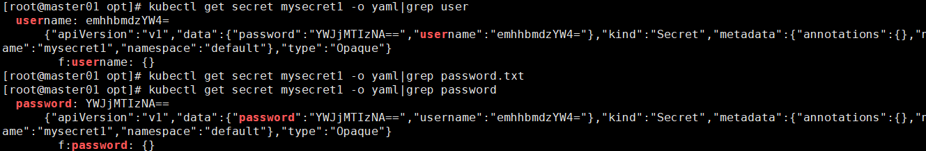 kubectl get secret mysecret1 -o yaml|grep password # 捕获password