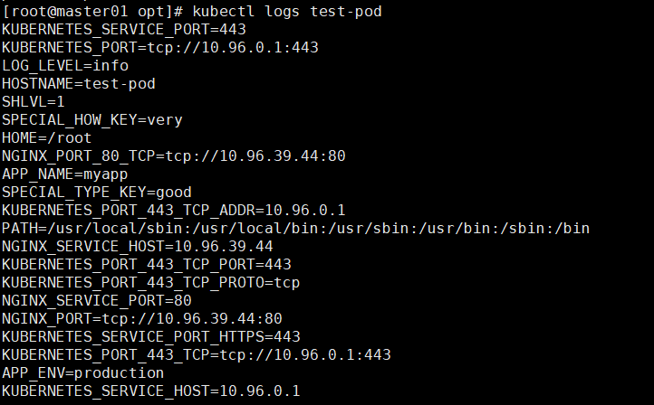 spec:containers:- name: busyboximage: busybox:1.28.4command: ["/bin/sh", "-c", "env"]env:- name: SPECIAL_HOW_KEYvalueFrom:configMapKeyRef:name: special-configkey: special.how- name: SPECIAL_TYPE_KEYvalueFrom:configMapKeyRef:name: special-configkey: special.typeenvFrom:- configMapRef:name: env-configrestartPolicy: Never# 执行一下